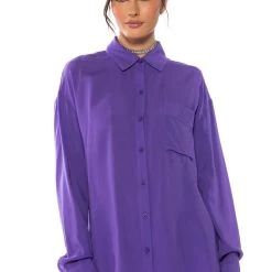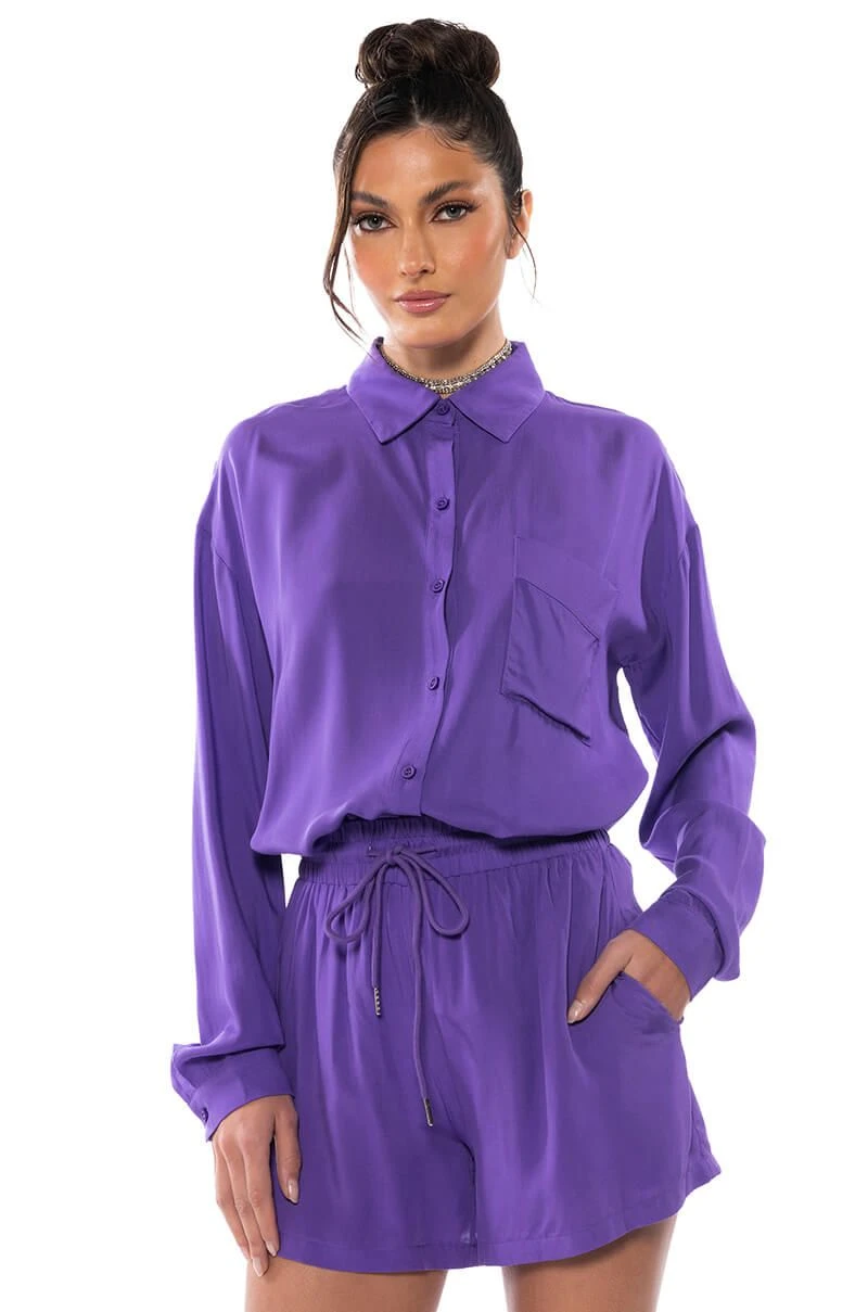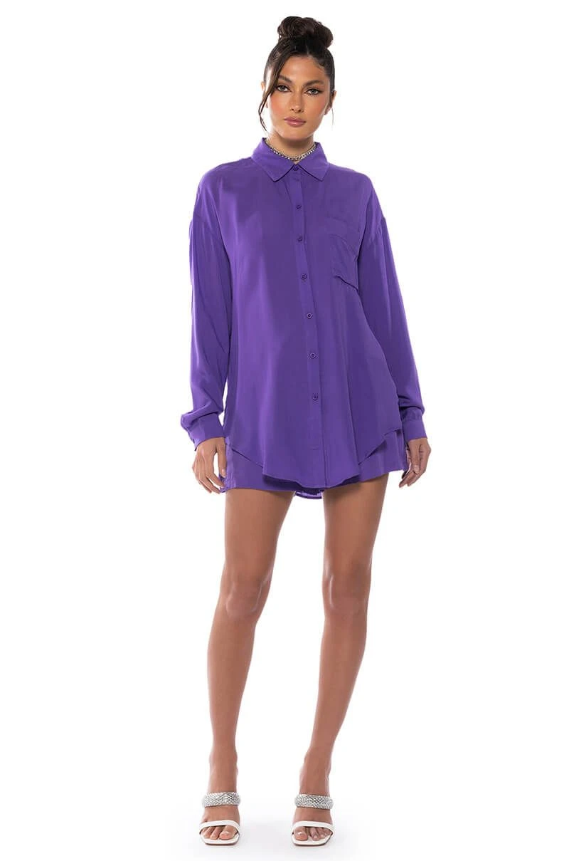 The AKIRA Label Purple Rain Button Down is made from a lightweight, smooth base fabrication and features a foldover collar, long sleeves with buttoned cuffs, and a front breast pocket. Complete with an oversized silhouette, rounded hems with side slits, and a button down front closure. Style with the matching bottoms, The AKIRA Label Purple Rain Drawstring Short, and chunky loafers for an easygoing chic look!