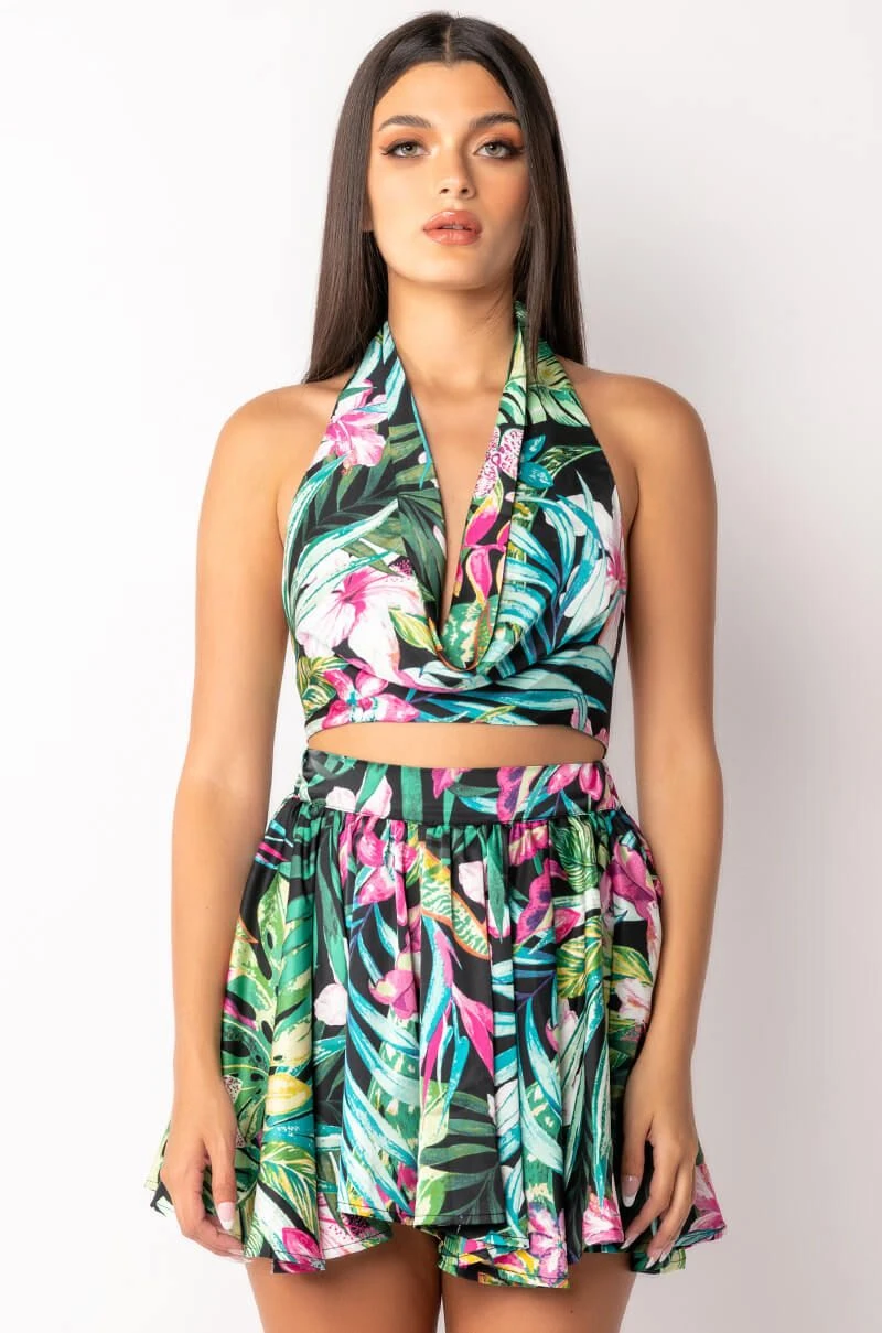 Celebrate yourself with The AKIRA Label Quality Time Floral Halter Top. This satin halter crop top features a floral orchid print pattern, a tie back halter neckline, an open back, and a scrunched elastic back band. Par this piece with the coordinating AKIRA Label Quality Time Floral Mini Shorts for a complete look.