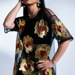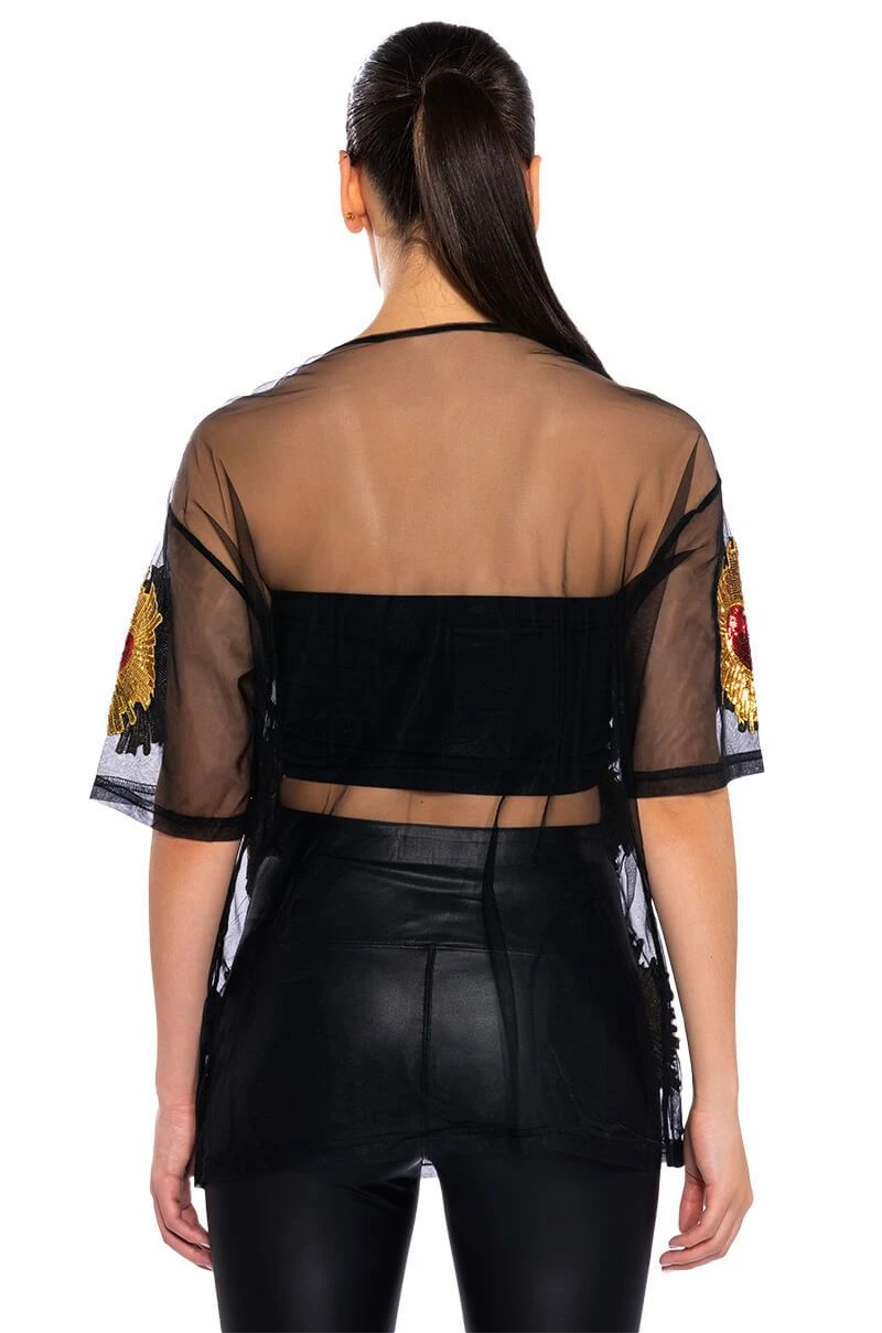 Show off your poker face in The AKIRA Label Queen Of Hearts Oversized Mesh Tee. This sheer top features a casual oversized cut, a crew neckline, short sleeves, sequin embroidered heart detailing, and a sheer mesh fabrication. Wear with biker shorts, high top sneakers, and oversized hoops.