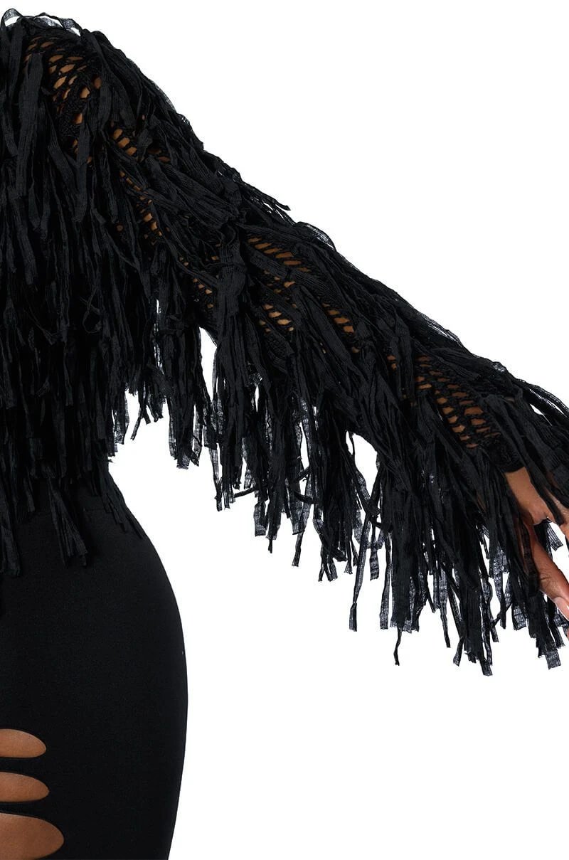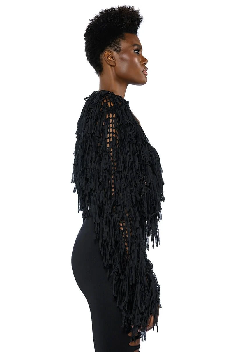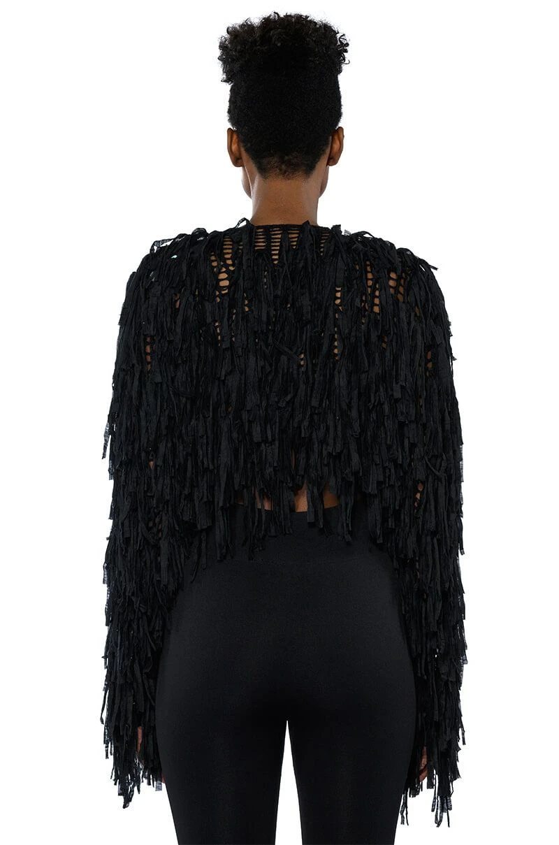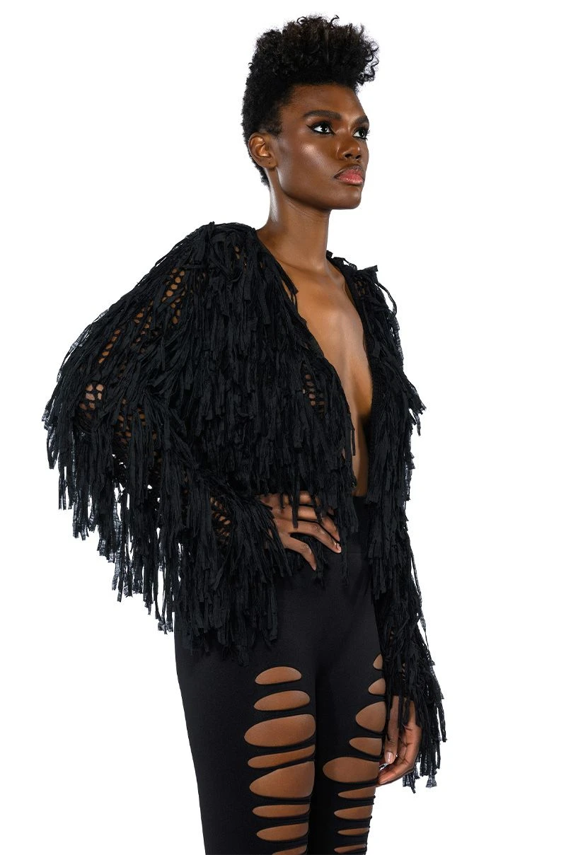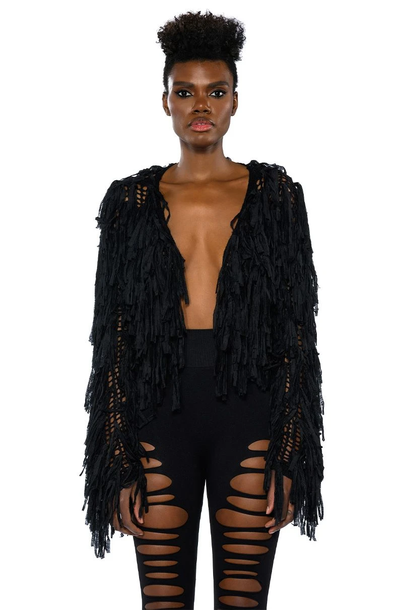 The AKIRA Label Raven Long Sleeve Fringe Knit Cardigan is made from a crochet base fabrication and features an all over fabric fringe design, long sleeves, an open front, and a cropped silhouette. Style this fringed shrug over a cropped tee and relaxed cargos for an easy, effortless look.
