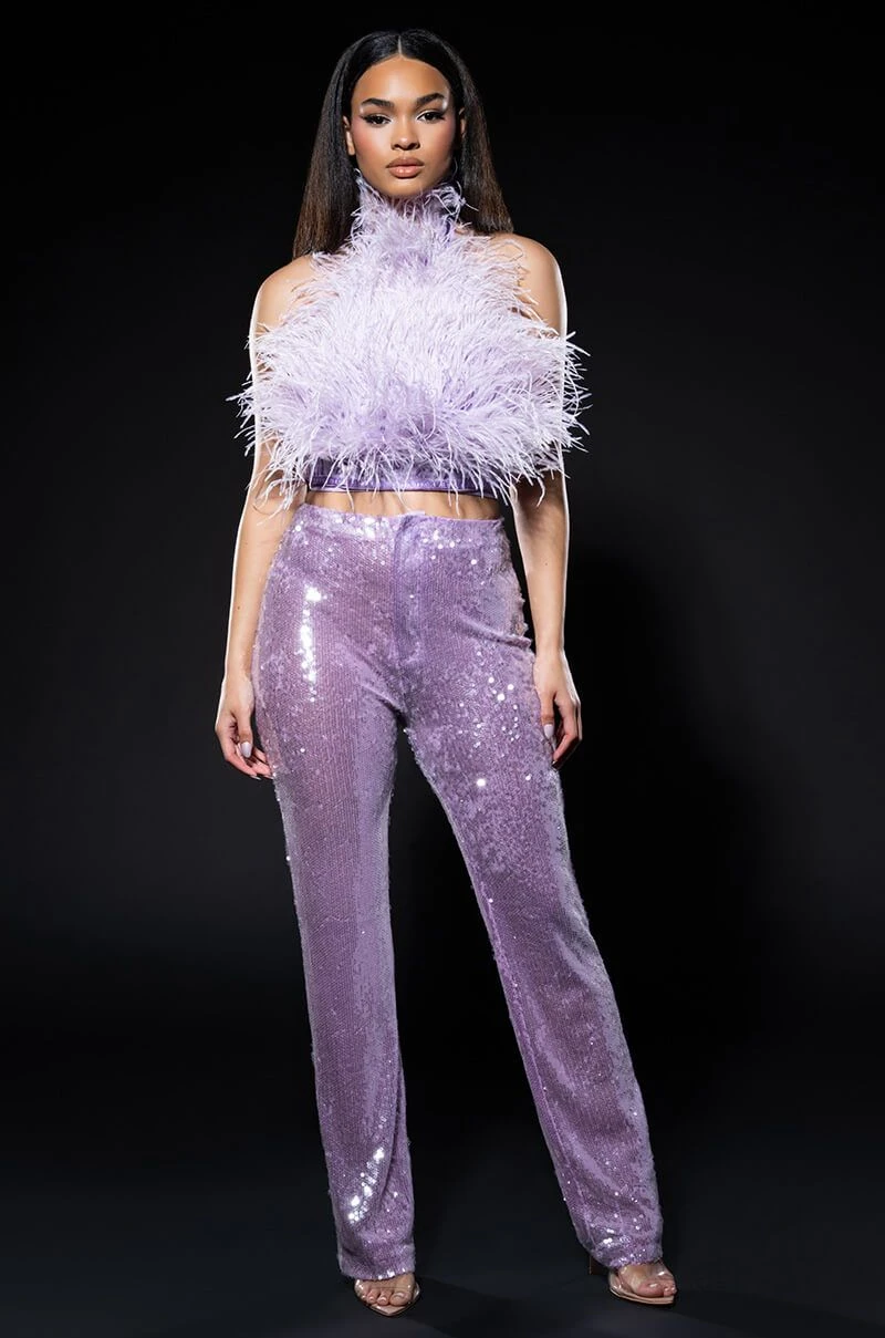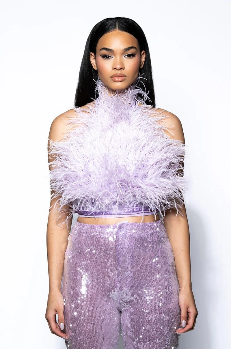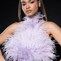 The AKIRA Label Real Ostrich Feather Top In Light Purple is made from a stretchy mesh fabrication and features layered opulent ostrich feathers throughout, a halter neckline with back button detailing, a sleeveless silhouette, an elastic hem, a sexy open back, and a cropped length. Complete with an exposed back zipper closure. Pair this piece with satin bottoms and pumps to complete your look.