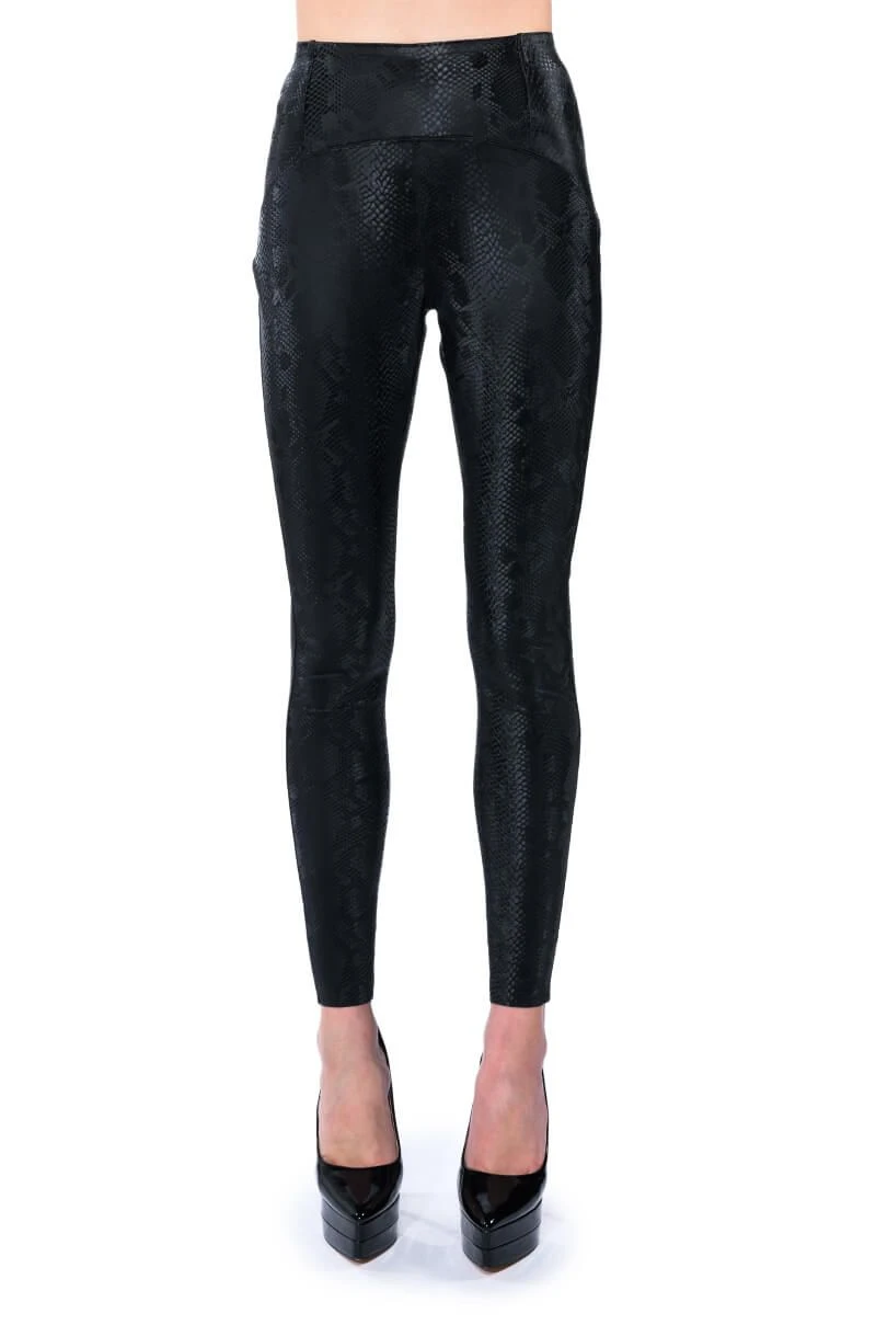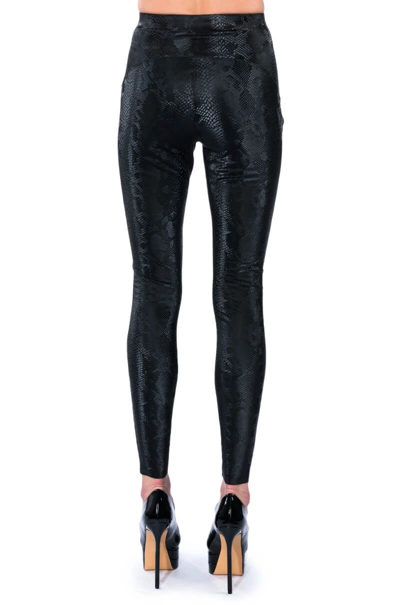 The AKIRA Label Rio Print High Rise Leggings With 4 Way Stretch in Black are the perfect faux leather leggings to get you through fall and winter. The stretchy leggings are complete with an elasticated waistband, a high rise fit, a snakeskin print faux leather fabrication, and a bodycon ankle length silhouette. Style them with a slouchy sweater and thigh high boots for a stylish wintery look.