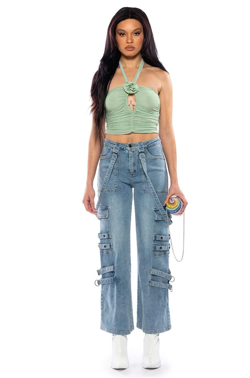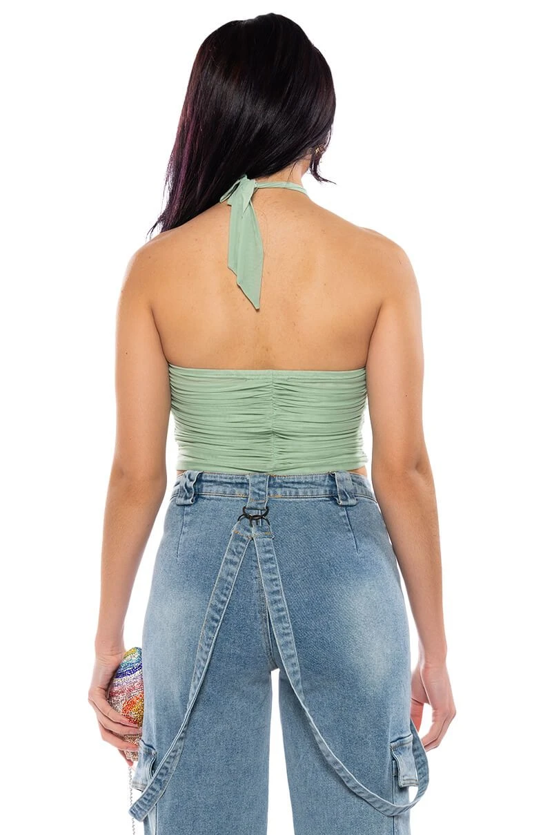 The AKIRA Label Sadie Sage Green Keyhole Halter Top is a chic and sassy number made from a stretchy, mesh base fabrication and features a self-tie halter neck, a floral applique at the center, keyhole cutout, sleeveless silhouette, and sexy ruched sides. Complete with an inner mesh lining, ruching at the back, and a slip-on fit. Style with wide leg jeans, a leather bomber jacket, and platform clogs for an effortless, that-girl look.