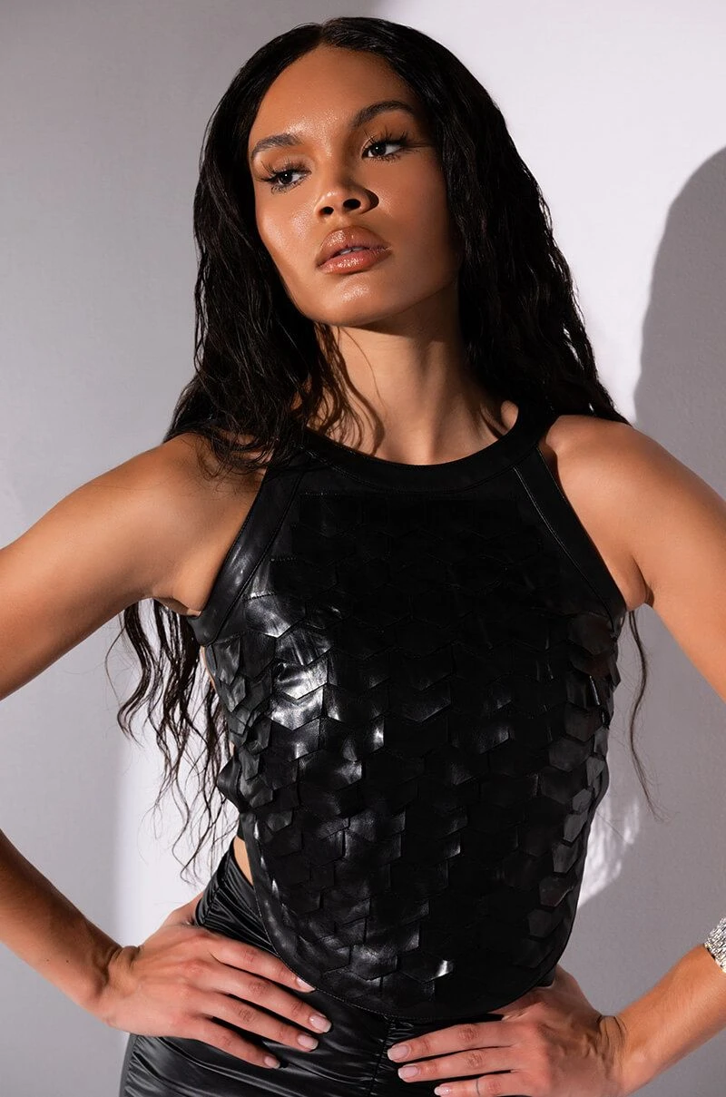 The AKIRA Label Scales Sleeveless Top is made from a pebbled vegan leather fabrication and features a high, rounded neckline, a sleeveless silhouette, vegan leather and mesh scale body detailing, a rounded hem, sexy open sides with stretchy bands, a cropped length, and an exposed back zipper closure.