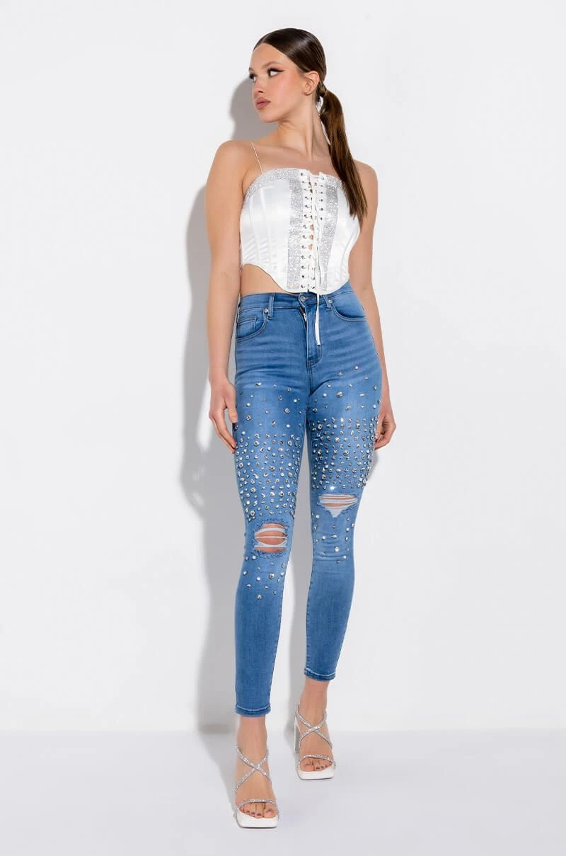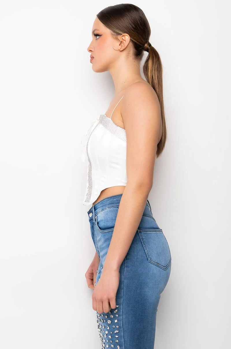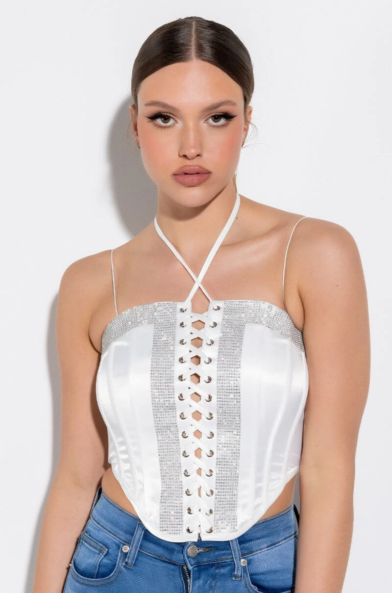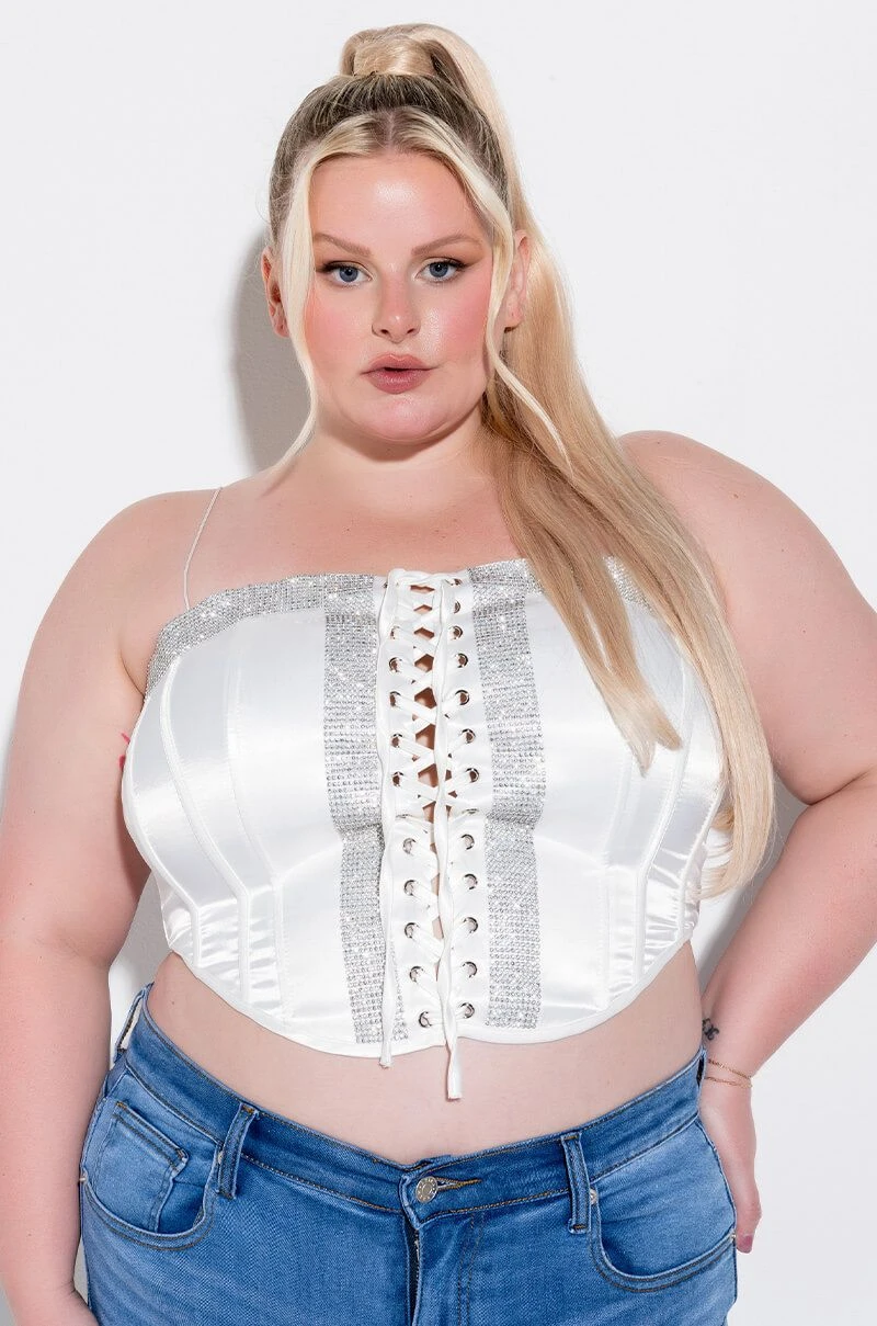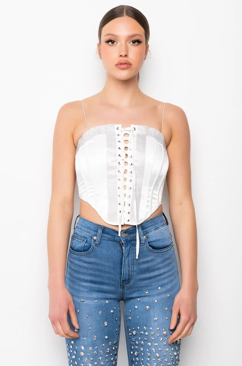The AKIRA Label Self Control Lace Up Rhinestone Satin Corset is made from a satin fabrication and features spaghetti straps, a lace up front enclosure, thick rhinestone band trim along the chest and bodice, boning for structure, a pointed hem, and an exposed back zipper closure.