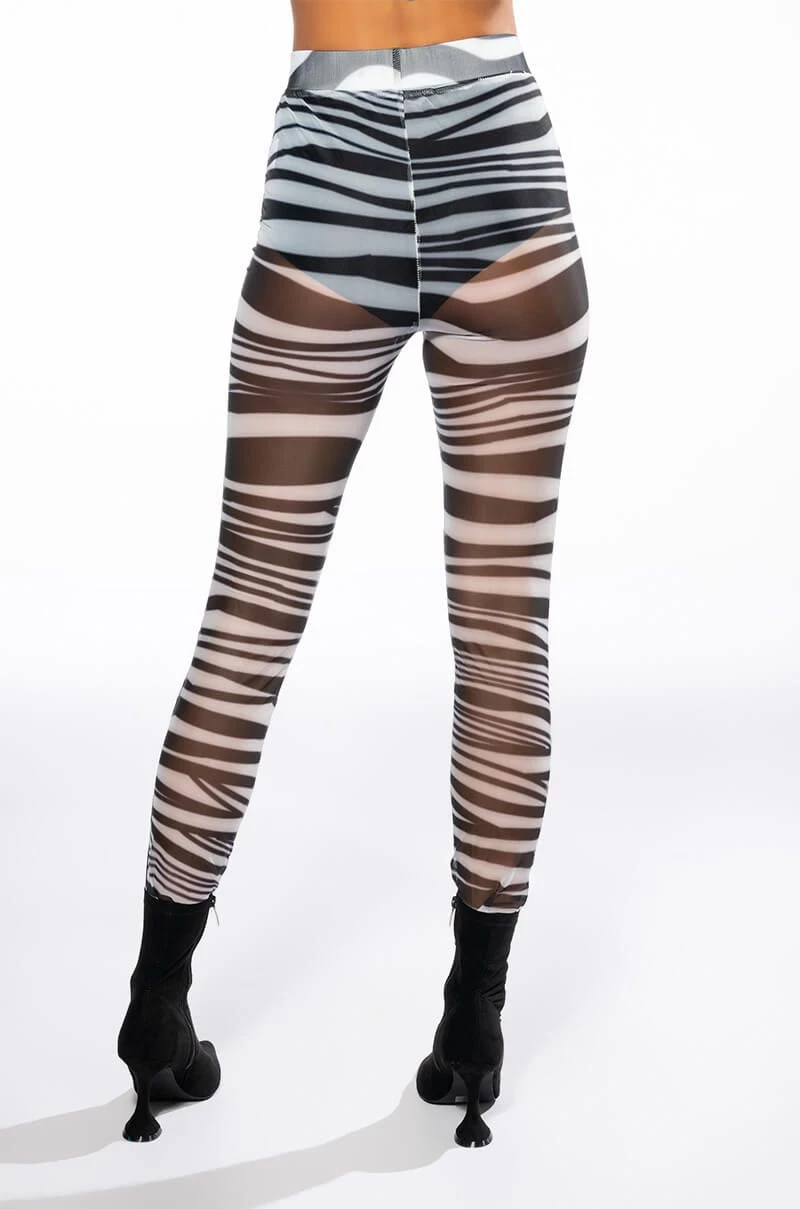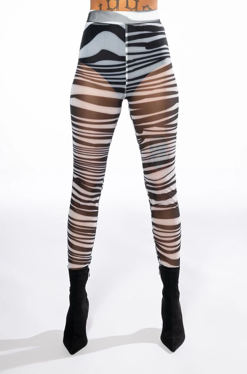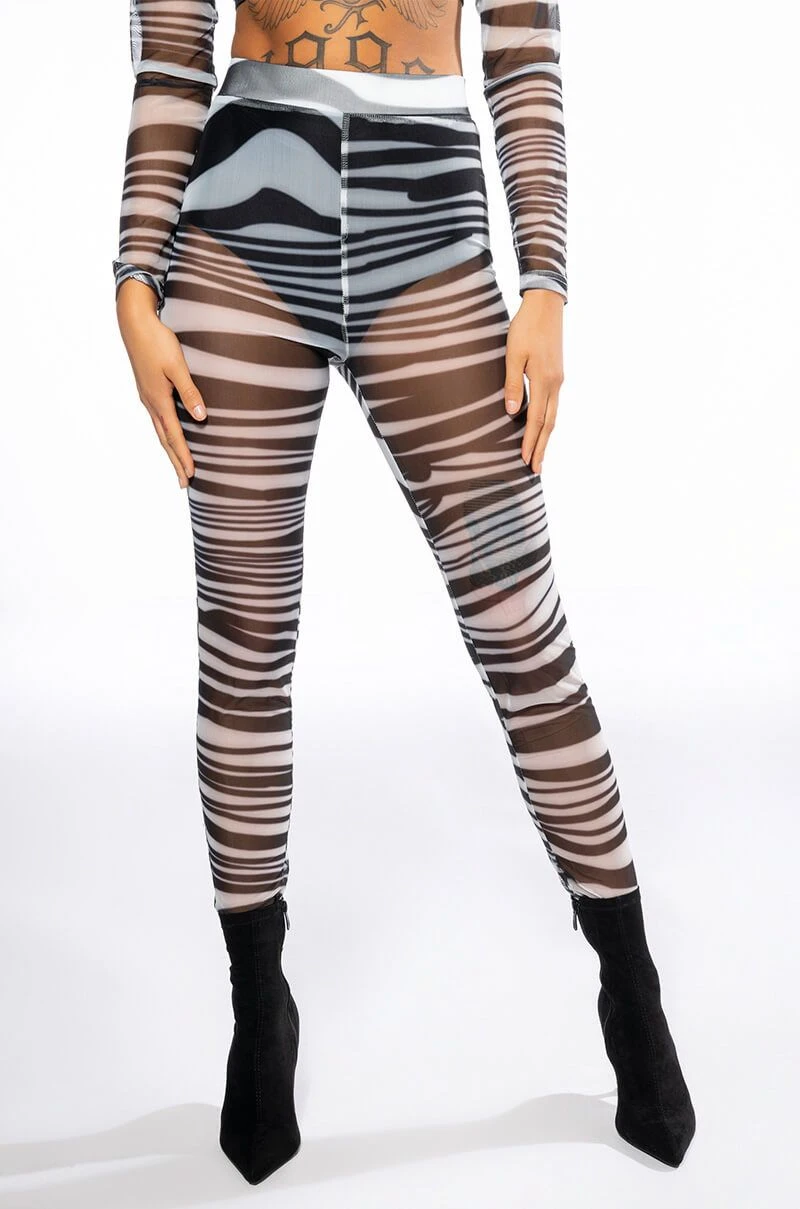 The AKIRA Label Set You Straight Mesh Legging features a high rise silhouette, an elasticated waistband, a stretchy sheer mesh fabrication, stripe print patterning, and a curve-hugging ankle-length silhouette. Style them with the coordinating AKIRA Label Set You Straight Long Sleeve Mock Neck Bodysuit for a bold matching look. Shown undergarment not included.