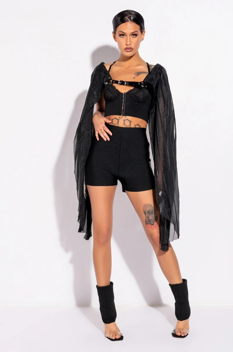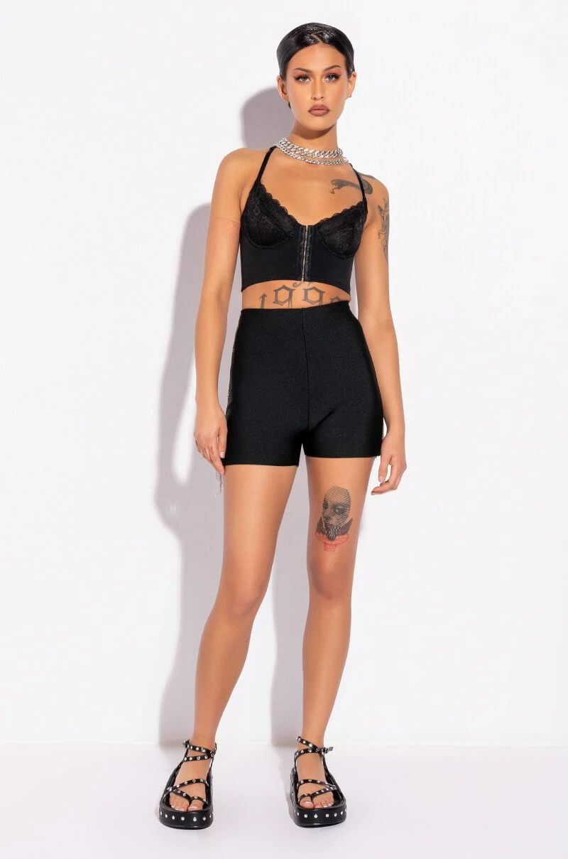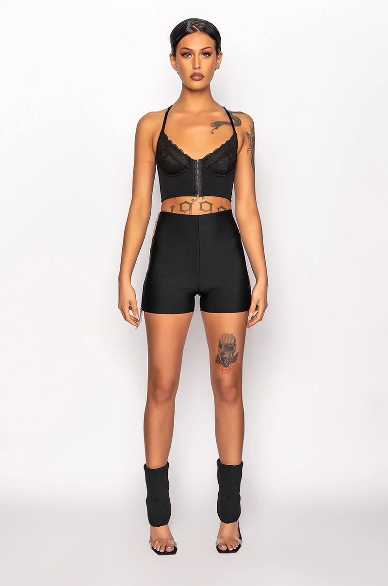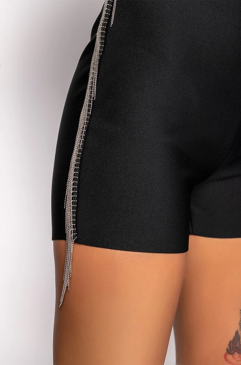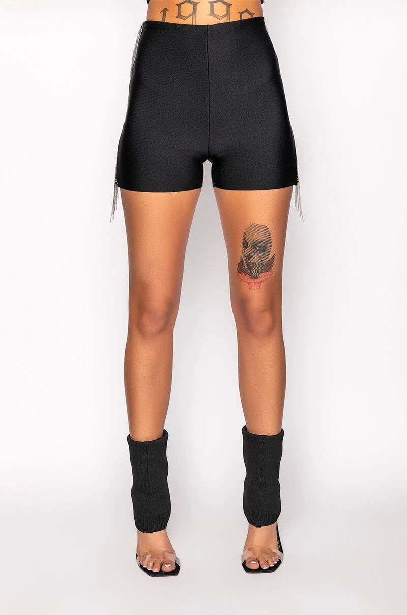 The AKIRA Label Shake It Fringe Detail Bandage Short features a bodycon bandage knit fabrication, a high rise waistline, an elasticized waistband, and a mini short length. Complete with metallic beaded chain fringe side stripe detailing. Pairs perfectly with button down shirts and strappy sandals.
