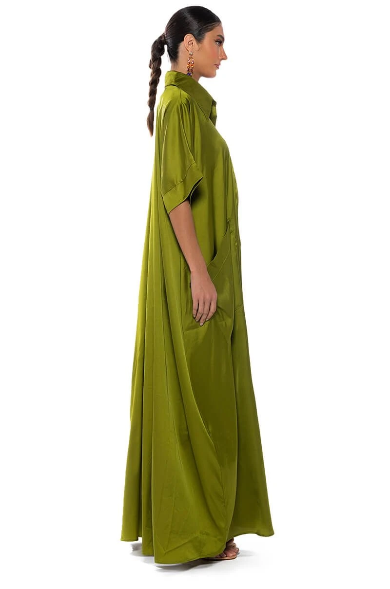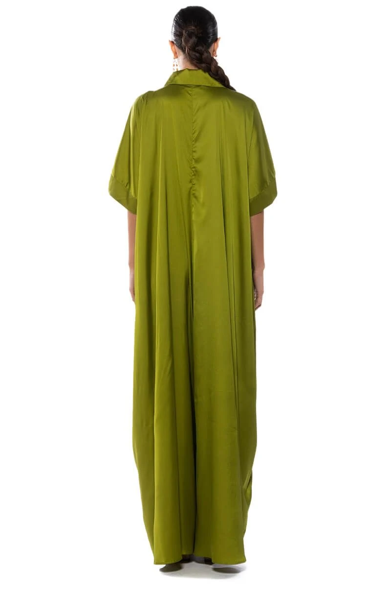 The AKIRA Label She’s Rich Oversized Satin Jumpsuit In Green is a sleek one piece featuring a satin fabrication, a fold over collar, a plunging neckline, boxy short sleeves, roomy front pockets, an oversized fit, and a wide leg silhouette. Complete with pop button front detailing. Pair this piece with platform booties or slip-on pumps to complete your look.
