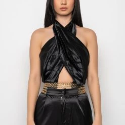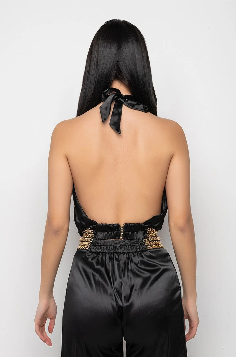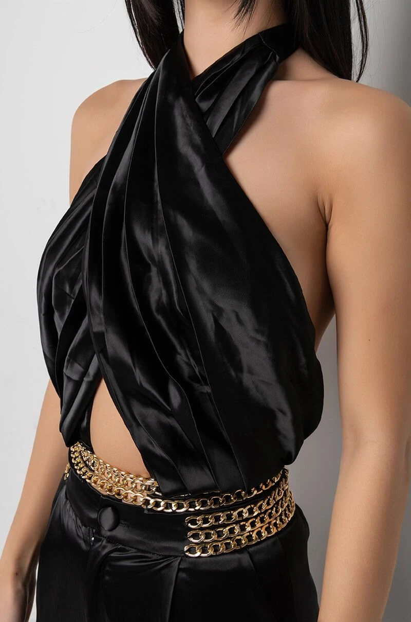 We’re living our Parisian fantasy in The AKIRA Label Sil Vous Plait Chain Detail Cropped Halter Blouse. This top is made from a lightweight satin fabrication and is complete with pleated detailing, a tie halter neckline, an open front design, layered chain links at the hem, and a shirred elastic backband with a small zipper closure. Complete your look with the matching AKIRA Label Sil Vous Plait Chain Detail Palazzo Pant.