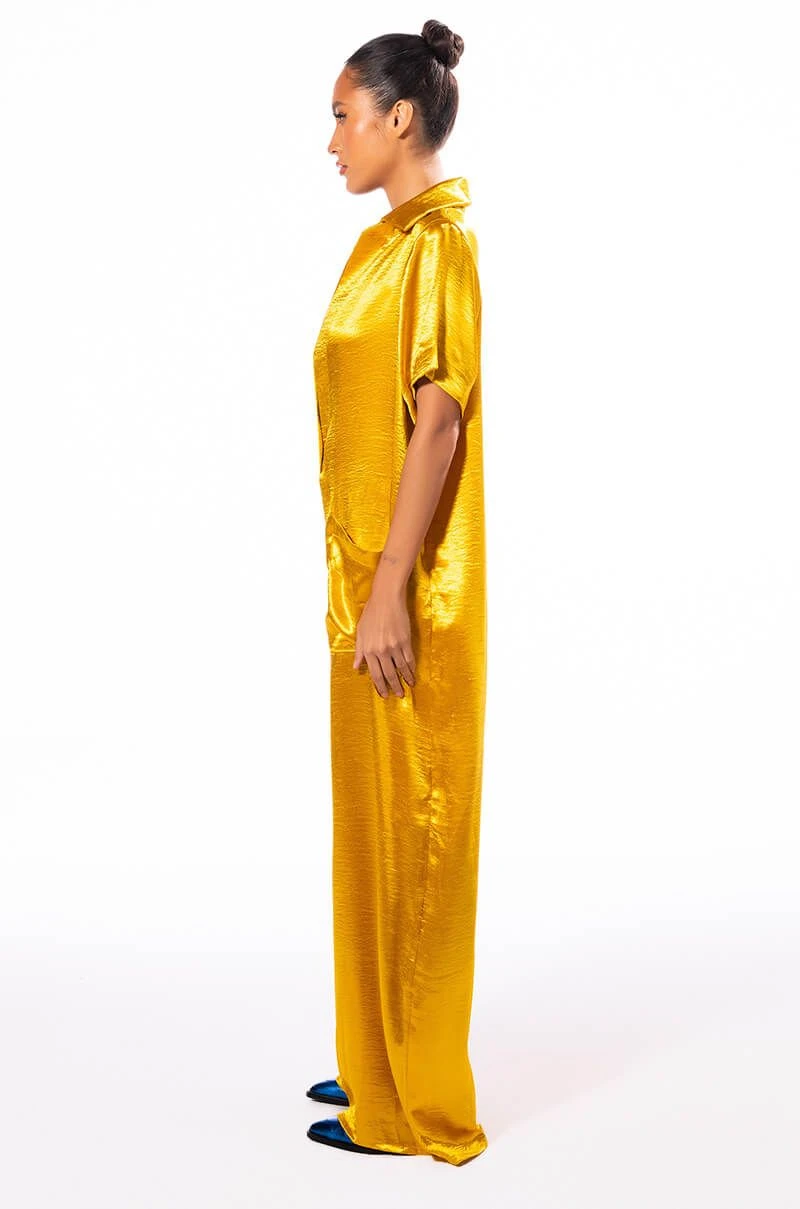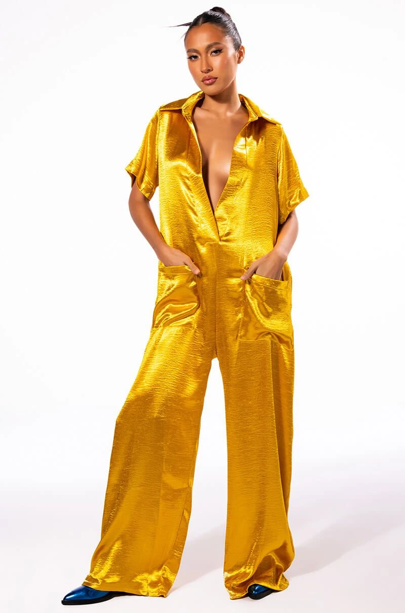 Let your success make noise with The AKIRA Label Silent Dreamer Short Sleeve Satin Jumpsuit! This sleek one piece is made from a textured satin fabrication and features a pointed collar, a plunging neckline, boxy short sleeves, front patch pockets, an oversized fit, and a wide leg silhouette. Pair this piece with platform sandals to complete your look.