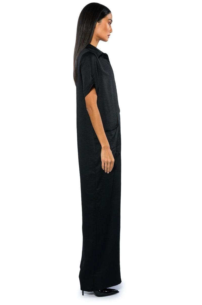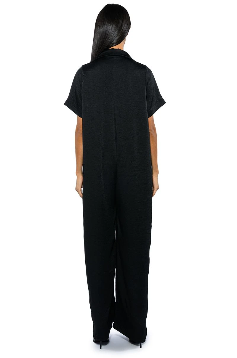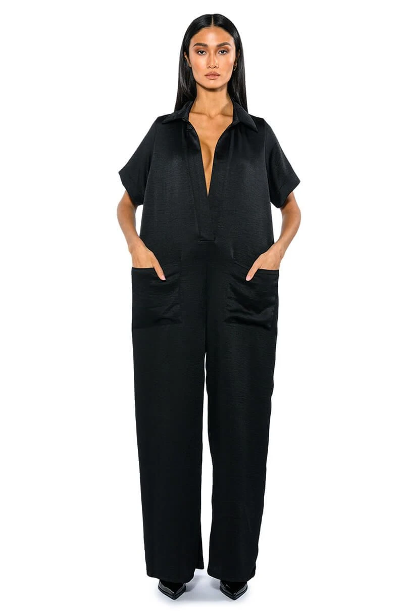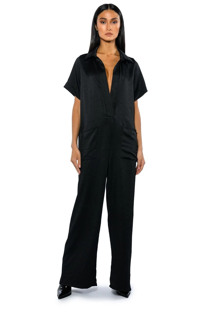 Let your success make noise with The AKIRA Label Silent Dreamer Short Sleeve Satin Jumpsuit! This sleek one piece is made from a textured satin fabrication and features a pointed collar, a plunging neckline, boxy short sleeves, front patch pockets, an oversized fit, and a wide leg silhouette. Pair this piece with platform sandals to complete your look.
