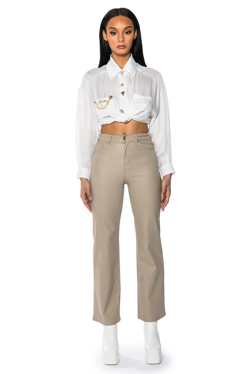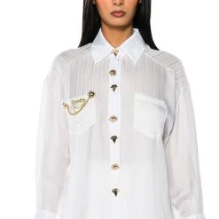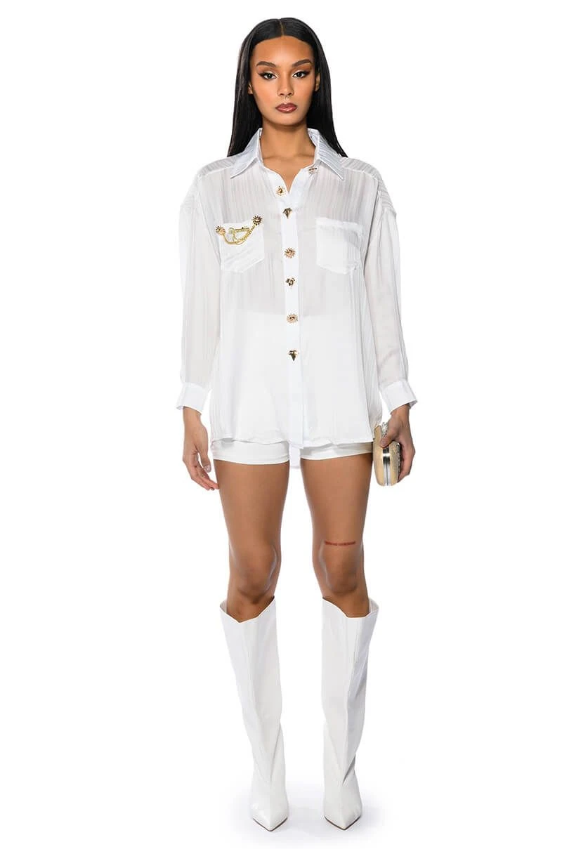 The AKIRA Label Stay Fly Oversized Button Down Blouse is a luxe sheer piece featuring three quarter length sleeves, a button down front placet, unique faux gold and bronze metallic button detailing, dual chest pockets, draped chain link pin accents,and a collared neckline. Complete with a longline silhouette and an oversized design. Style this flowy piece atop trousers and a corset for an elegant dinner date look.
