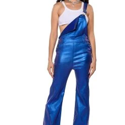 Forever far out. The AKIRA Label Stay Wavy Metallic Overalls feature a shimmer, stretchy, denim-inspired fabrication, a classic pinafore design, adjustable buckled bib straps, a large bib pocket, functional belt loops, button sides, slant side pockets, and back pockets, Complete with a wide leg fit.