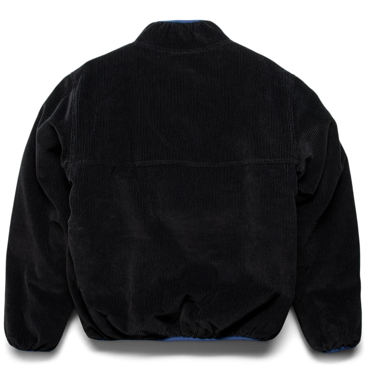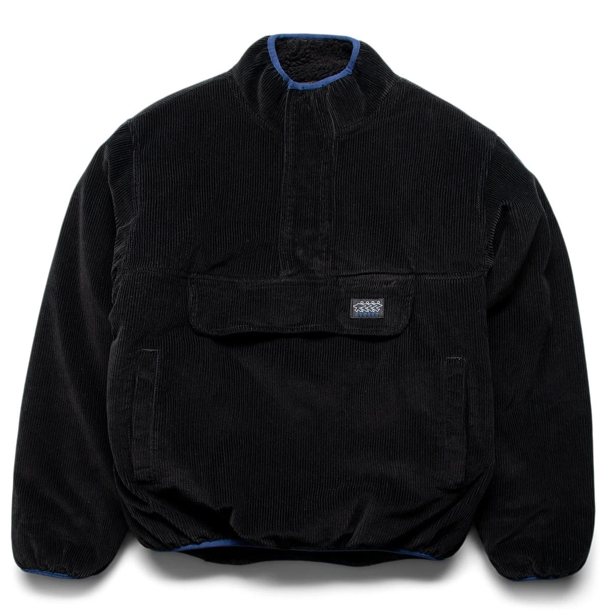 Corduroy half zip pullover. Fully lined sherpa interior, mock neck with concealed metal snaps, kangaroo pocket, and lycra bound cuff and hems. Finished with Stüssy Surfman label on front pouch pocket.