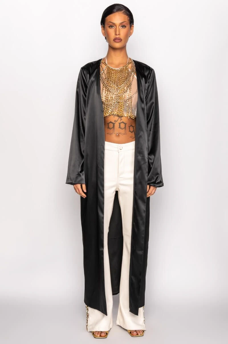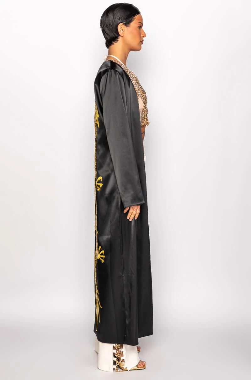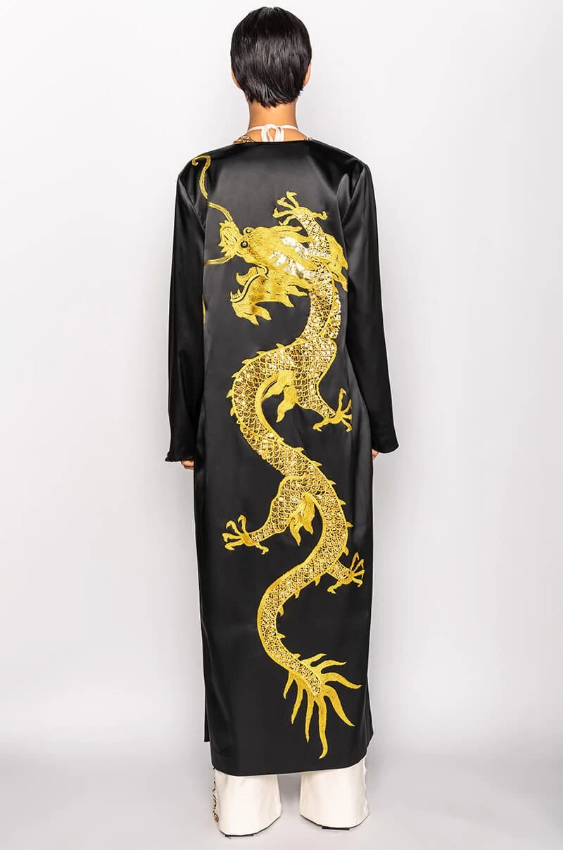 The AKIRA Label Sumptuous Satin Duster With Embroidered Dragon is made from a layered satin fabrication and is complete with long sleeves, an open front, a maxi length silhouette, and a large embroidered dragon on the back with sequin detailing. Pair this piece with casual or dressed up looks alike to add some color and fierce dragon power to your look!
