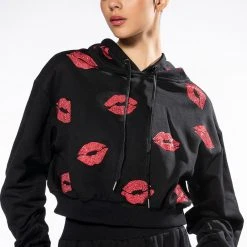 We have strong feelings for The AKIRA Label Superlove Hoodie. This cozy sweater features an attached drawstring hood, long sleeves, and a slightly cropped, boxy silhouette. Complete with lipstick kiss print patterning and tonal rhinestone detailing. Pair this piece with the matching AKIRA Label Superlove Jogger and platform sneakers to complete your look!