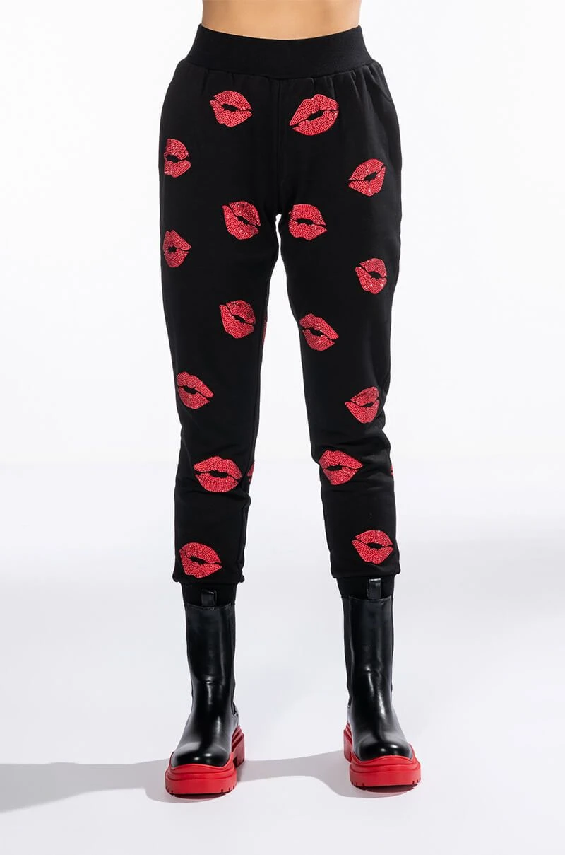 We have strong feelings for The AKIRA Label Superlove Jogger. These comfy athleisure pants feature a cozy cotton blend fabrication, an elasticated waistband, ribbed knit trim, slant side pockets, and a jogger silhouette with cinched ankle hems. Complete with rhinestone-embellished lipstick print patterning. Pair this piece with the matching AKIRA Label Superlove Hoodie to complete your look!