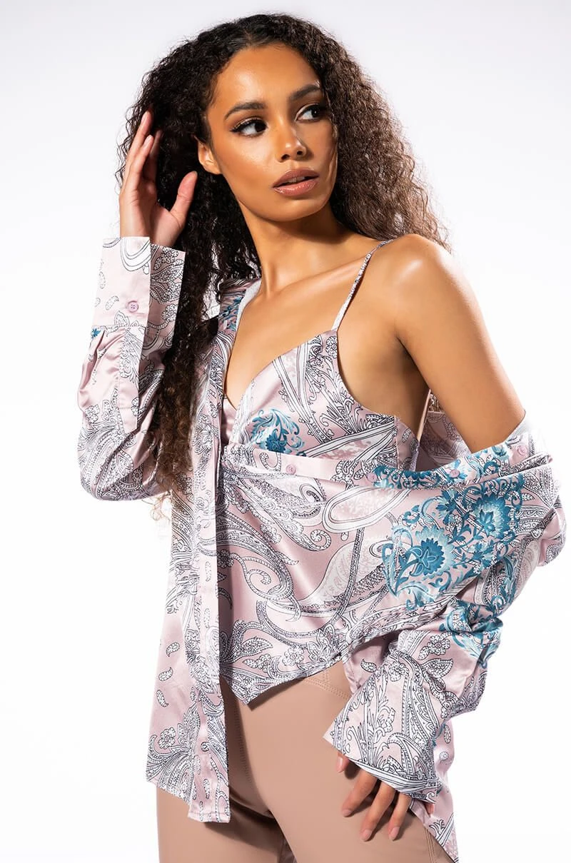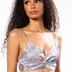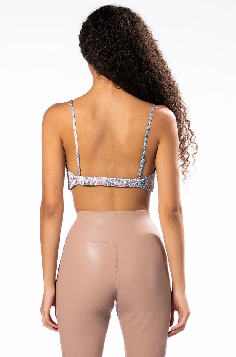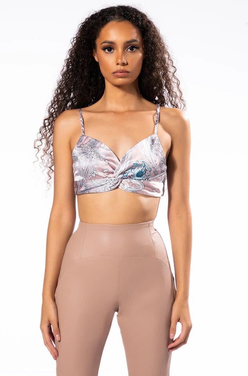 The AKIRA Label Sure Thing Twisted Front Bralette is made from a slick satin fabrication and features an artsy paisley print, adjustable spaghetti straps, a plunging cross front neckline with twist front detail, a cropped silhouette, and a thin ruched elastic back band. Pair this piece with the matching AKIRA Label Sure Thing Button Up Blouse and straight leg jeans to complete your look.