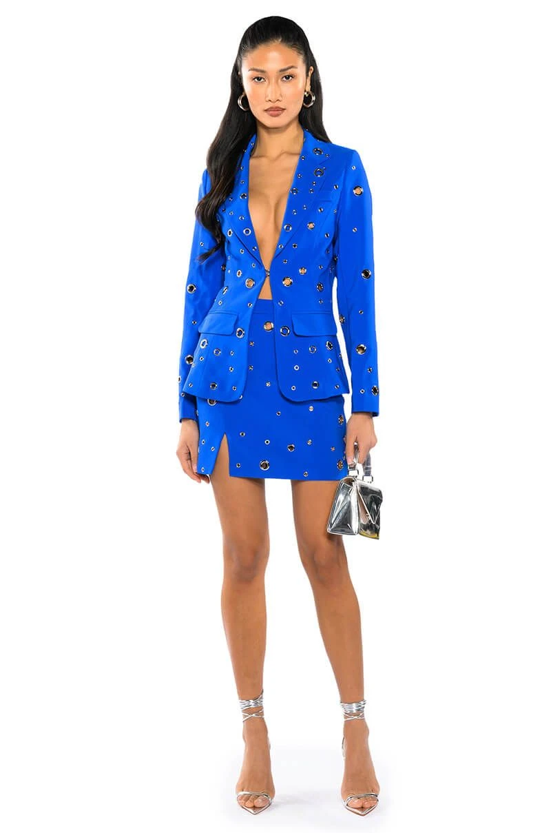 The AKIRA Label Take A Bow Mini Skirt With Slit is a unique take on the classic mini skirt. Made from a sleek polyester base fabric, these bottoms feature an all over grommet detail design, a high waisted silhouette, and form-flattering princess seaming. Complete with a smooth satin inner lining, a front leg slit, and a concealed back zipper closure. Pair with the coordinating AKIRA Label Take A Bow Blazer Jacket and platform boots for a show-stopping look!