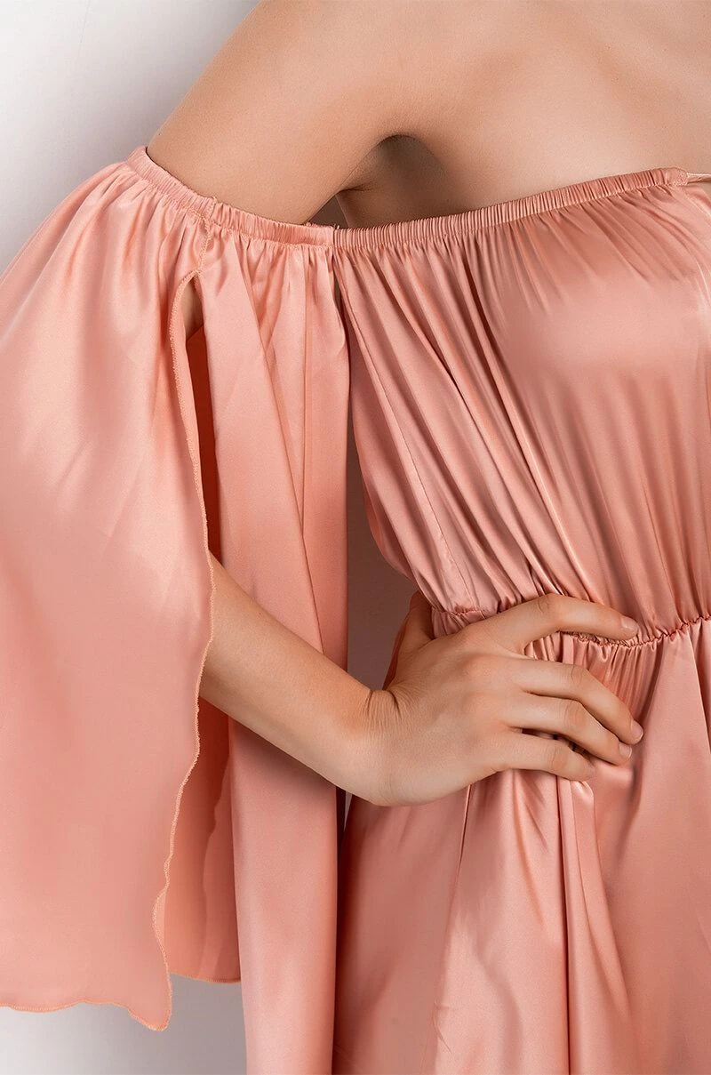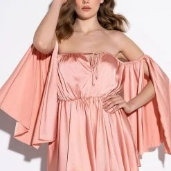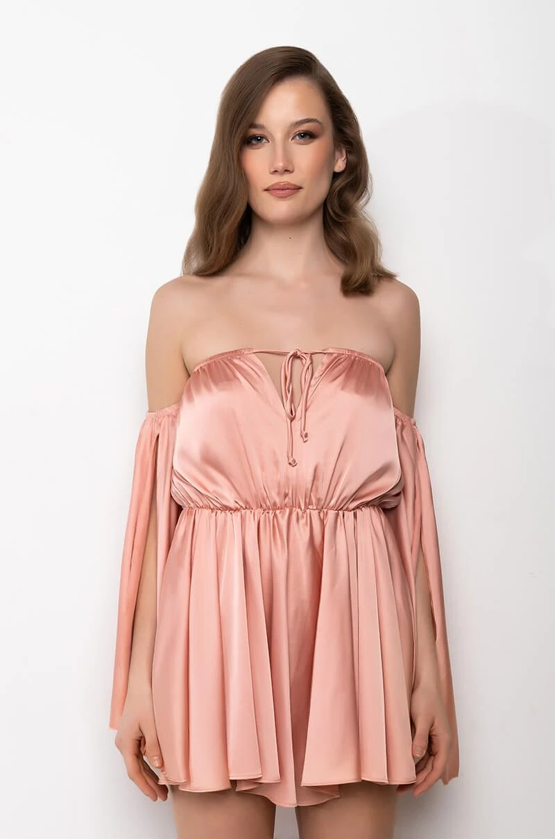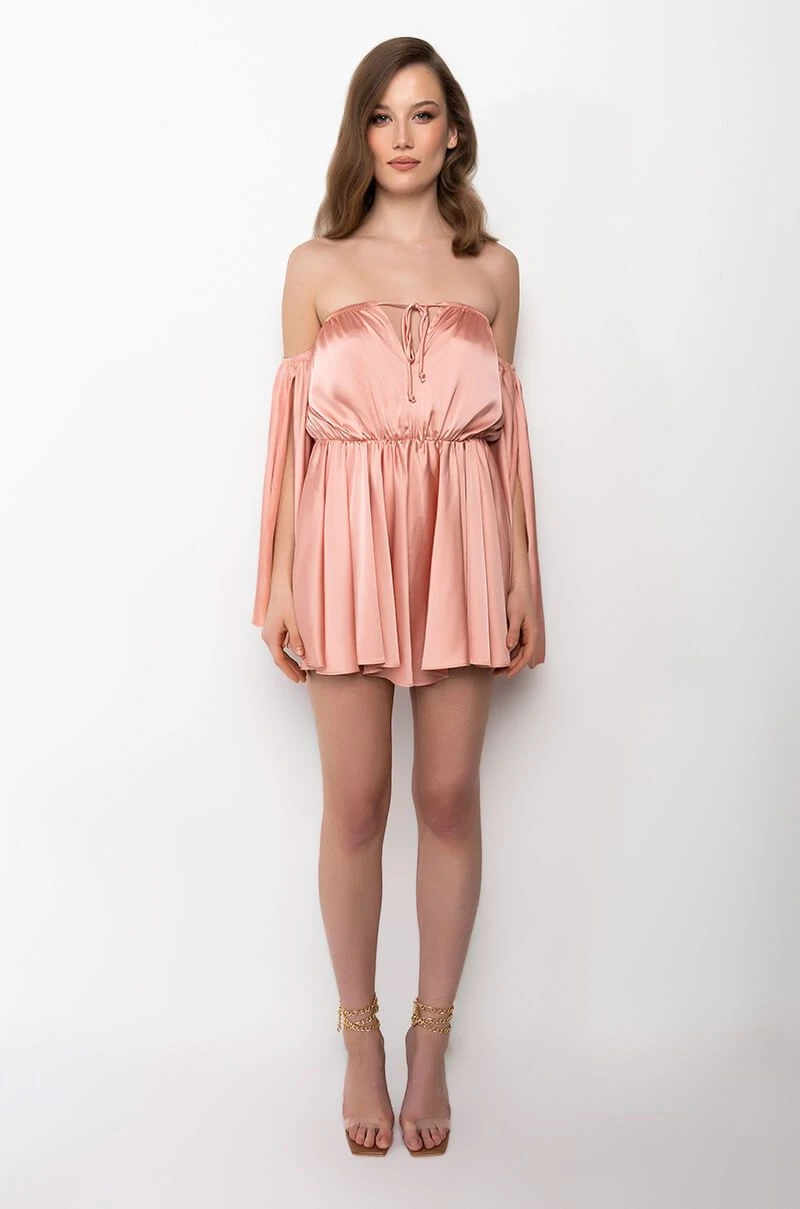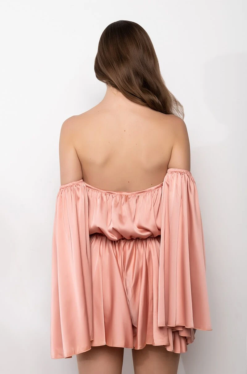 The AKIRA Label Take You There Off The Shoulder Romper is made from a luxe satin fabrication and features an off the shoulder silhouette, a deep V neckline with ties, long open sleeves with slits, an elastic waist, and attached shorts with a flowy overlay.