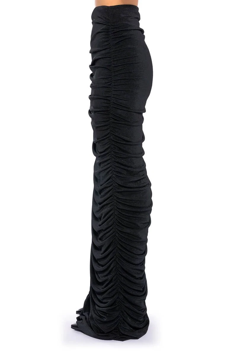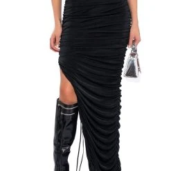 Give ‘em something to talk about in The AKIRA Label Talk About It Ruched Maxi Skirt. This stretch jersey maxi skirt features an elastic waistband, a bodycon silhouette, ruched detailing throughout, and a sultry side slit accent. Complete with a smooth inner lining and a pull on fit.