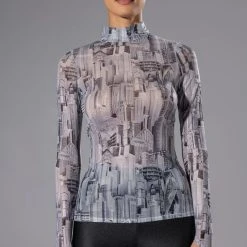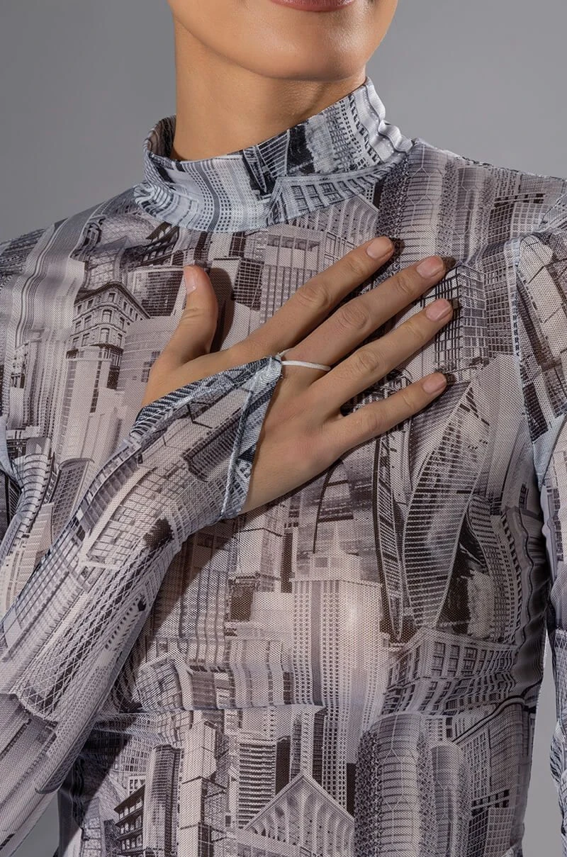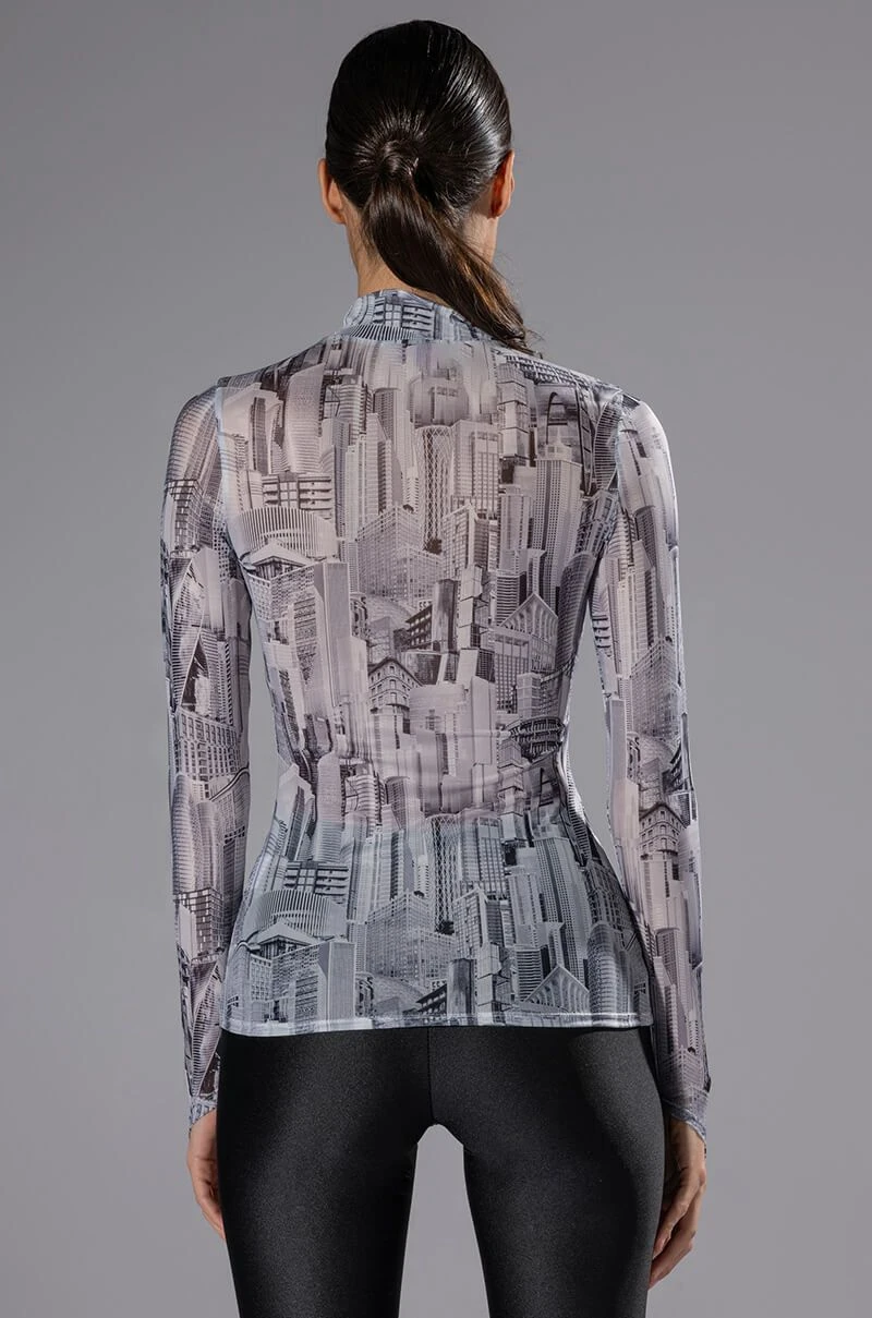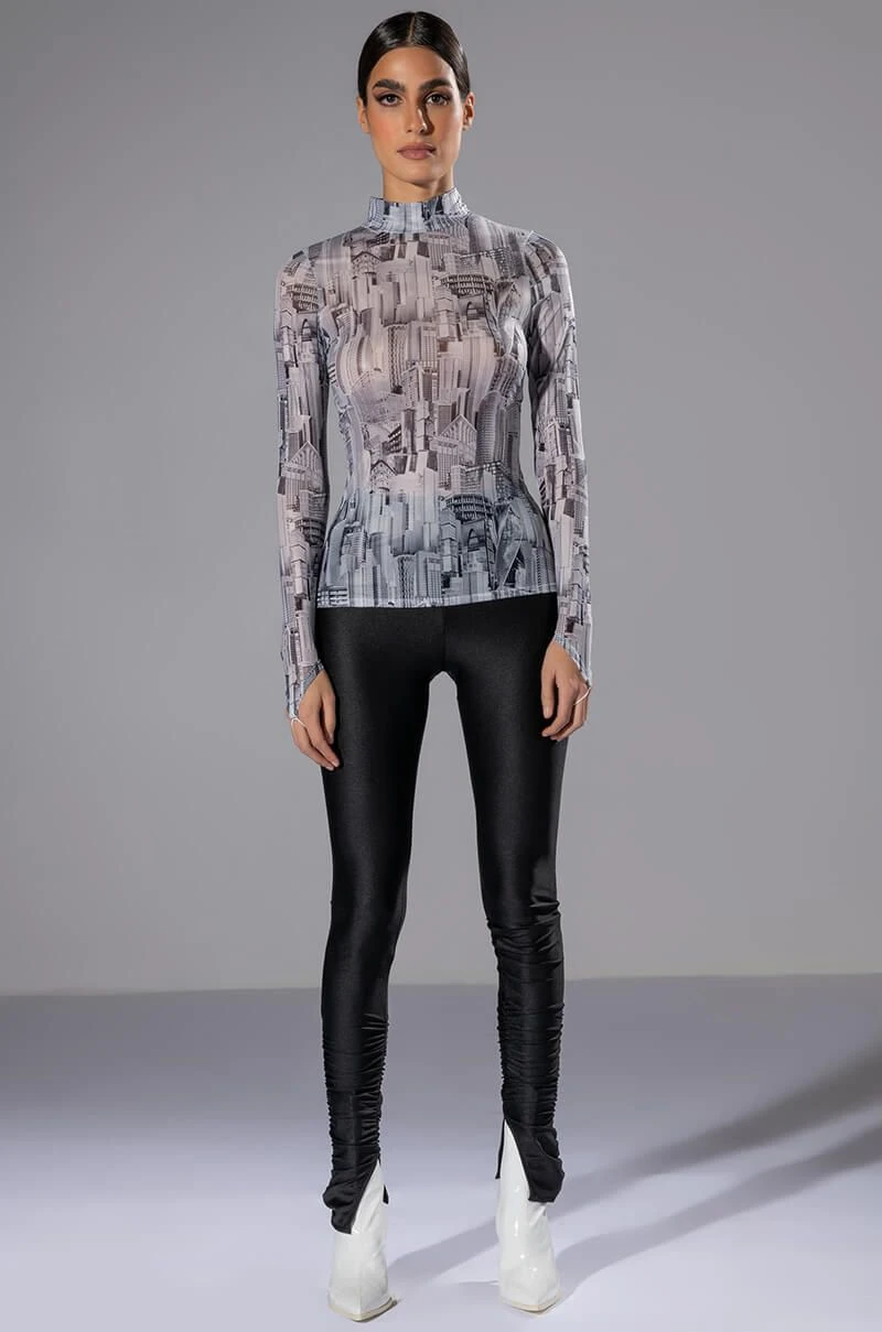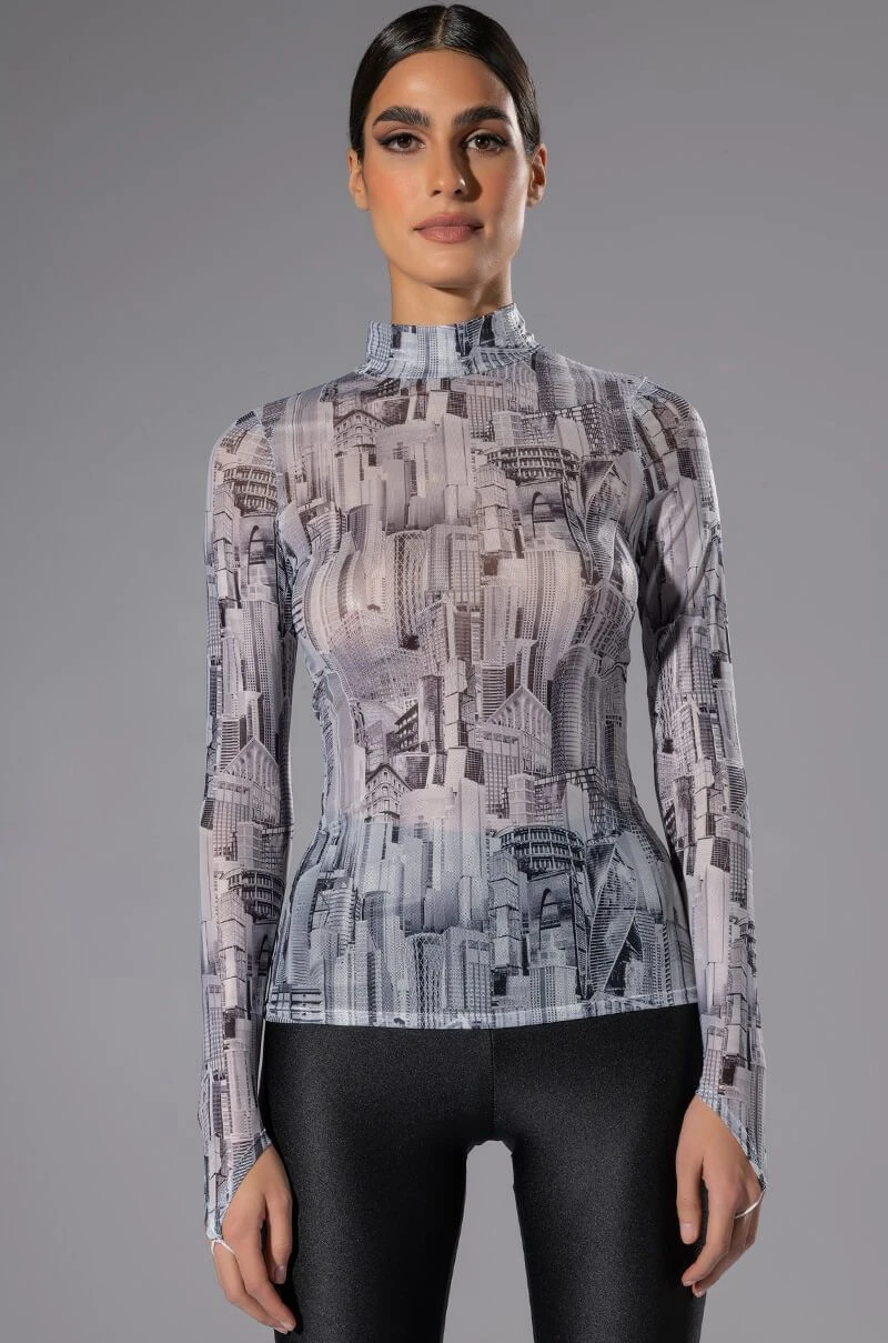 The AKIRA Label Taya Long Sleeve Mesh Top features a sheer mesh base, a mock neckline, and long sleeves with a middle finger loop. Complete with an allover graphic print design of high rise buildings. Pair with wide leg trousers and open-toe pumps for a completed city-girl look!