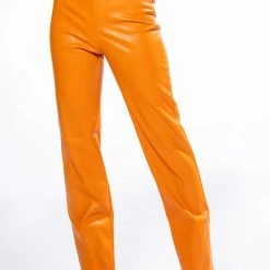 ¡Con mucho amor! The AKIRA Label Te Quiero High Rise Vegan Leather Straight Leg Pants In Orange are a stretchy vegan leather pant featuring a soft fleece lining, belt loops, a high rise waistline, two back pockets, and wide leg silhouette. Complete with a front button and zipper closure.