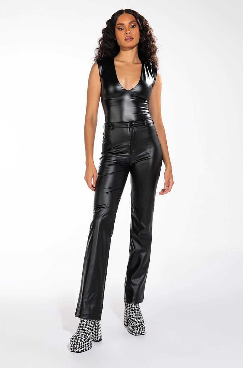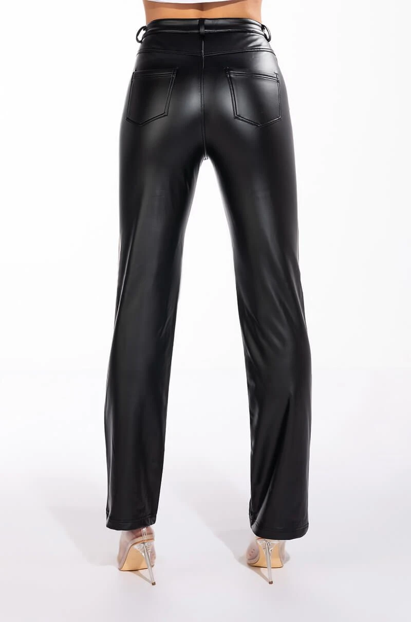 ¡Con mucho amor! The AKIRA Label Te-Quiero High Rise Vegan Leather Wide Leg Pant With 4 Way Stretch is made from a soft and stretchy vegan leather fabrication and is complete with a soft fleece lining, belt loops, a high rise waistline, two back pockets, and wide leg pants with a front button and zipper closure.
