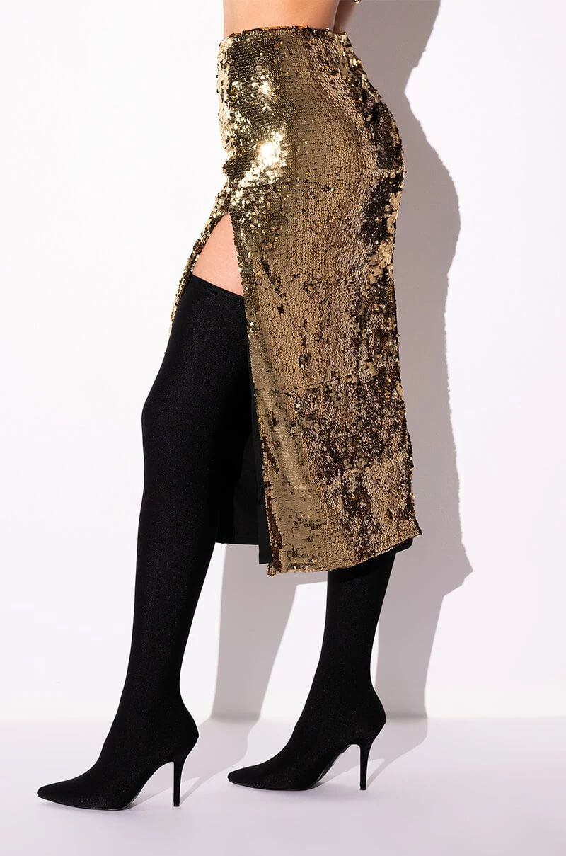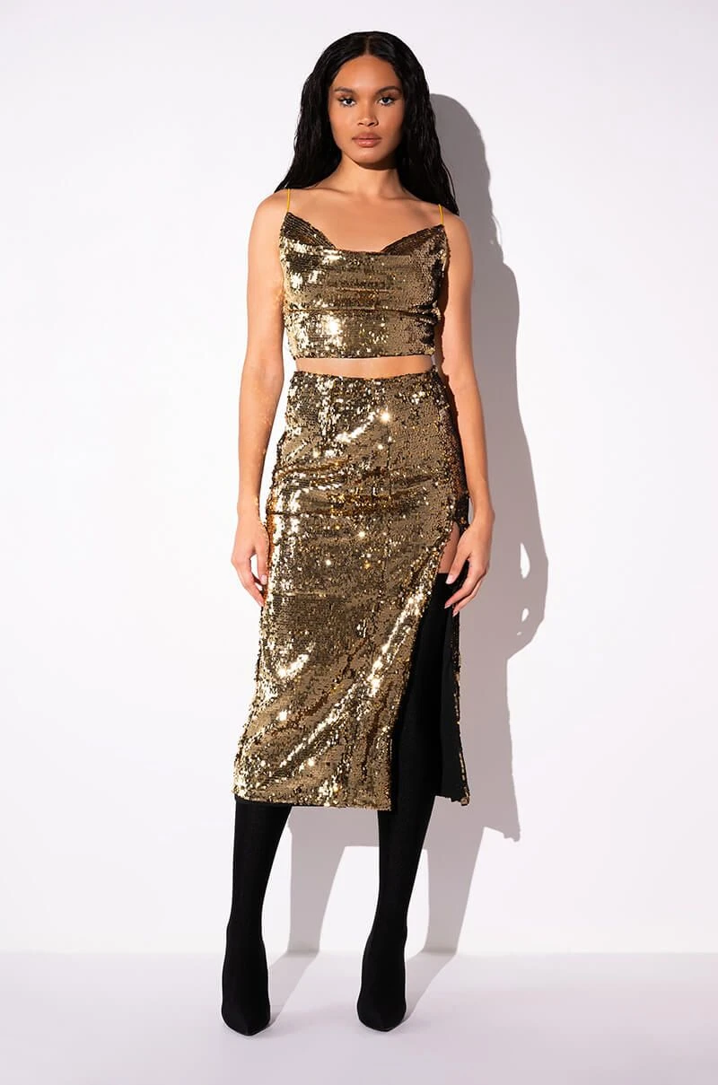 The AKIRA Label Thank The Academy High Slit Mesh Maxi Skirt features a sequin-embellished fabrication, a maxi length silhouette, a sexy high side slit, a smooth inner lining, and a concealed back zipper closure. Pair this glimmering piece with the coordinating AKIRA Label Thank The Academy Sleeveless Cowl Neck Crop Top for a complete look.