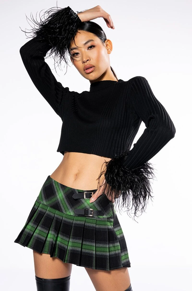 Cute yet sassy, The Akira Label The Flirt Pleated Micro Mini Skirt is made from a light plaid flannel fabrication and features a low rise waist with pleated detailing. The micro mini length design is completed with inner lining shorts, faux double buckles, and a hidden side zipper closure. Style this piece with thigh high boots to complete your look!