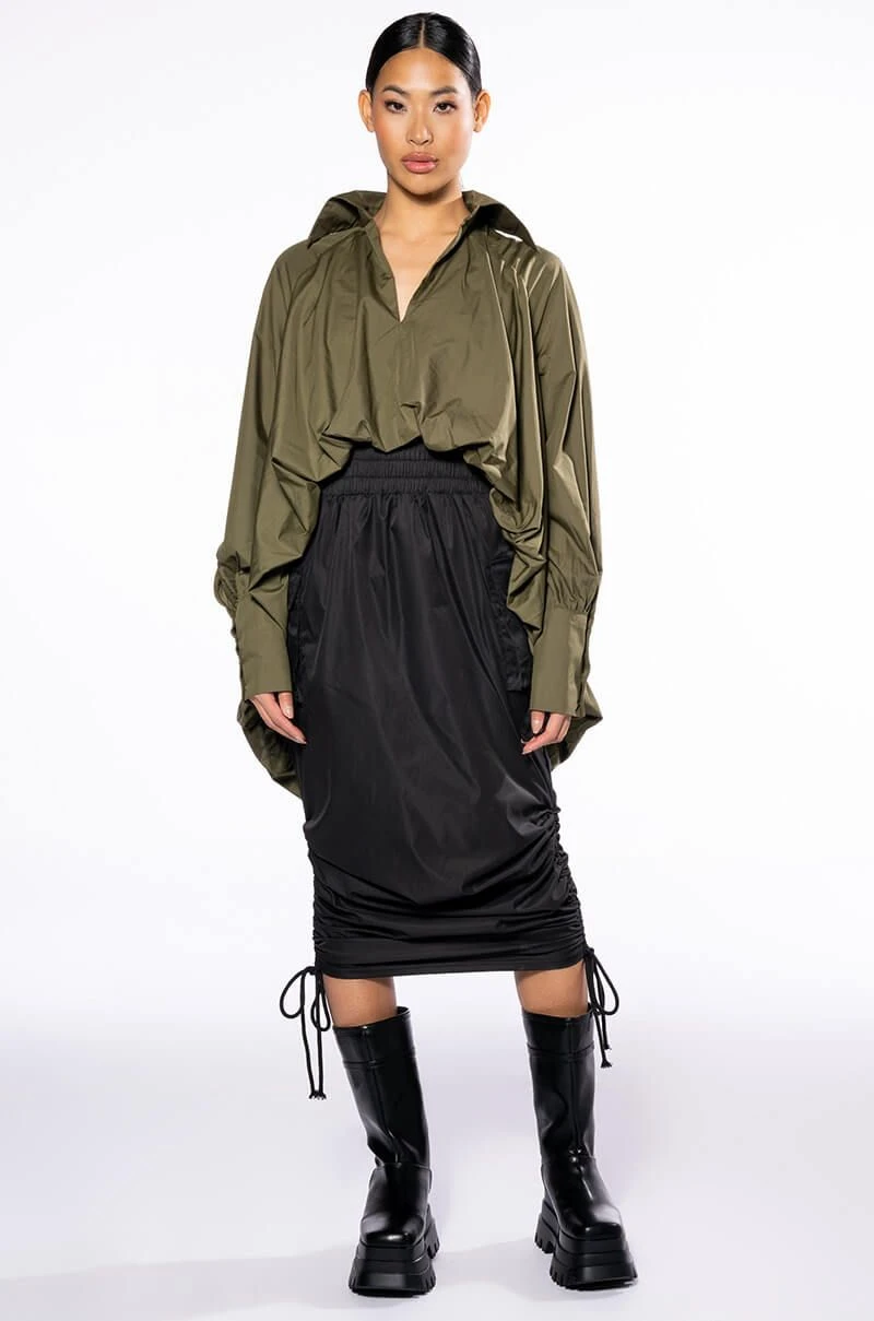 -15.5” from shoulder to shortest hem, 34” from shoulder to longest hem, 32” sleeves