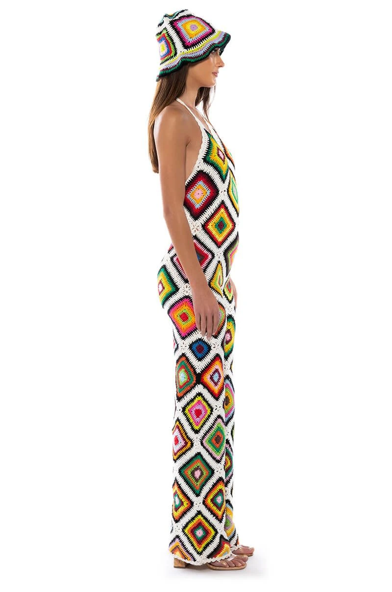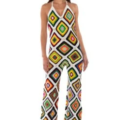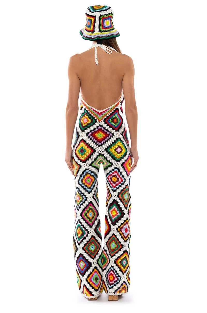The AKIRA Label The Way You Groove Crochet Halter Jumpsuit in White Multi features patchwork of cotton crochet granny squares, an unlined base, a slight v neckline, and a tie back closure. Complete with an open back and attached wide leg pants. Perfect ensemble for a beach day or music festival!
