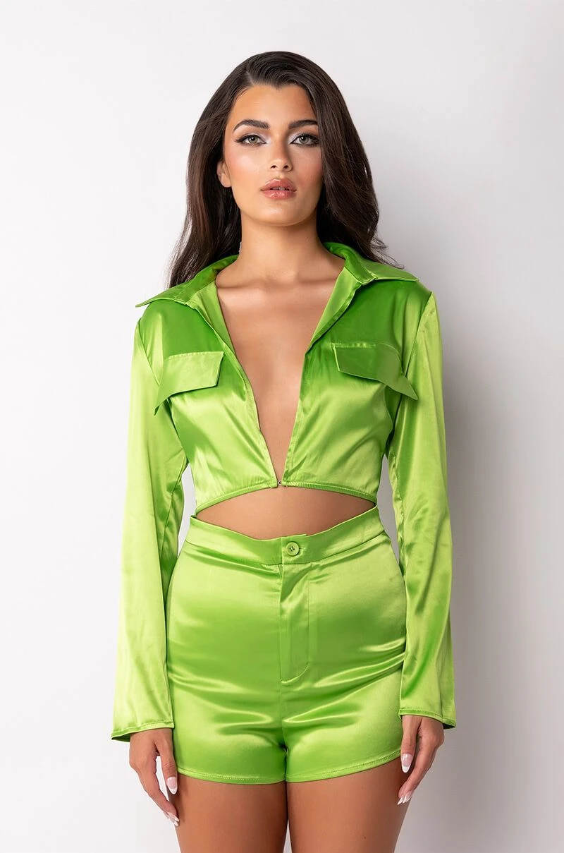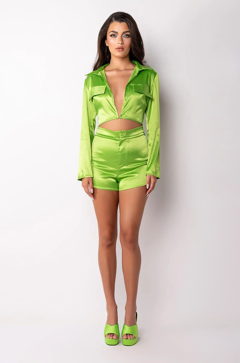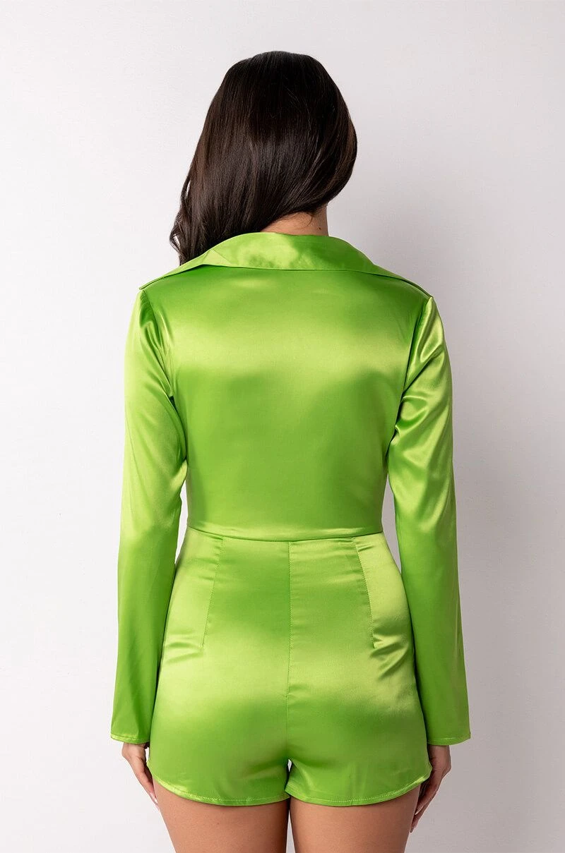Stay sexy and sleek with the The AKIRA Label Too Fly Cut Out Romper. This soft satin piece features a plunging neckline, attached mini shorts, and a cut out mid section. Complete with long sleeves, a fold over collar, faux flap front pockets, and a front hook and eye closure. Pair with strappy sandals and a patent shoulder bag for your next girls’ night out.