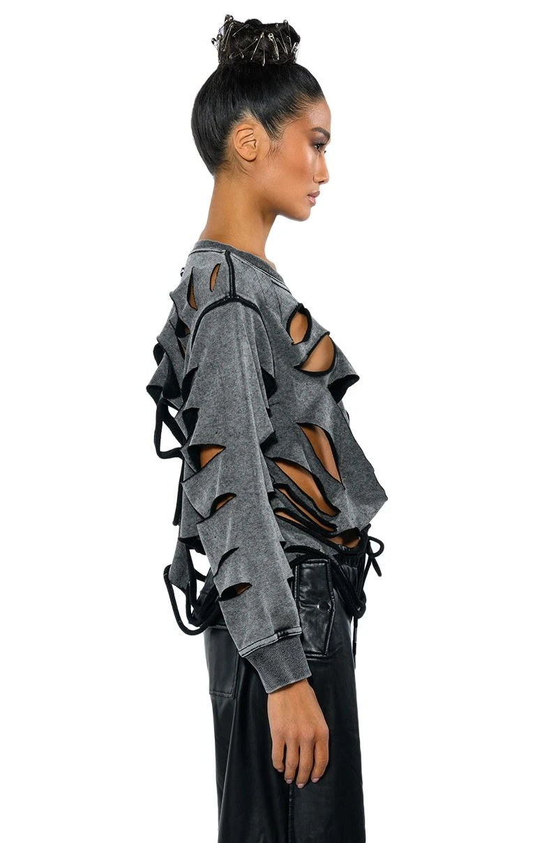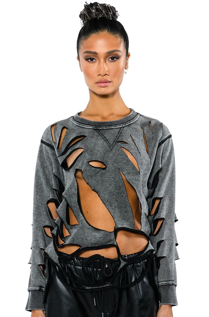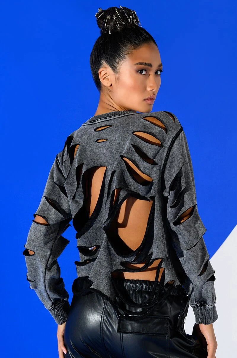 The AKIRA Label Torn Heart Distressed Long Sleeve Pullover is a soft crewneck sweater featuring a smooth knit fabrication, long sleeves, ribbed cuffs, and ultra-distressed detailing throughout.