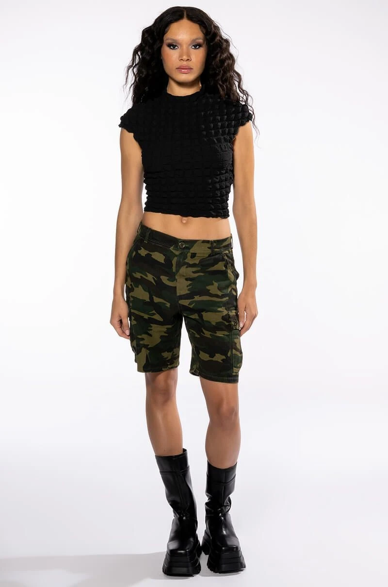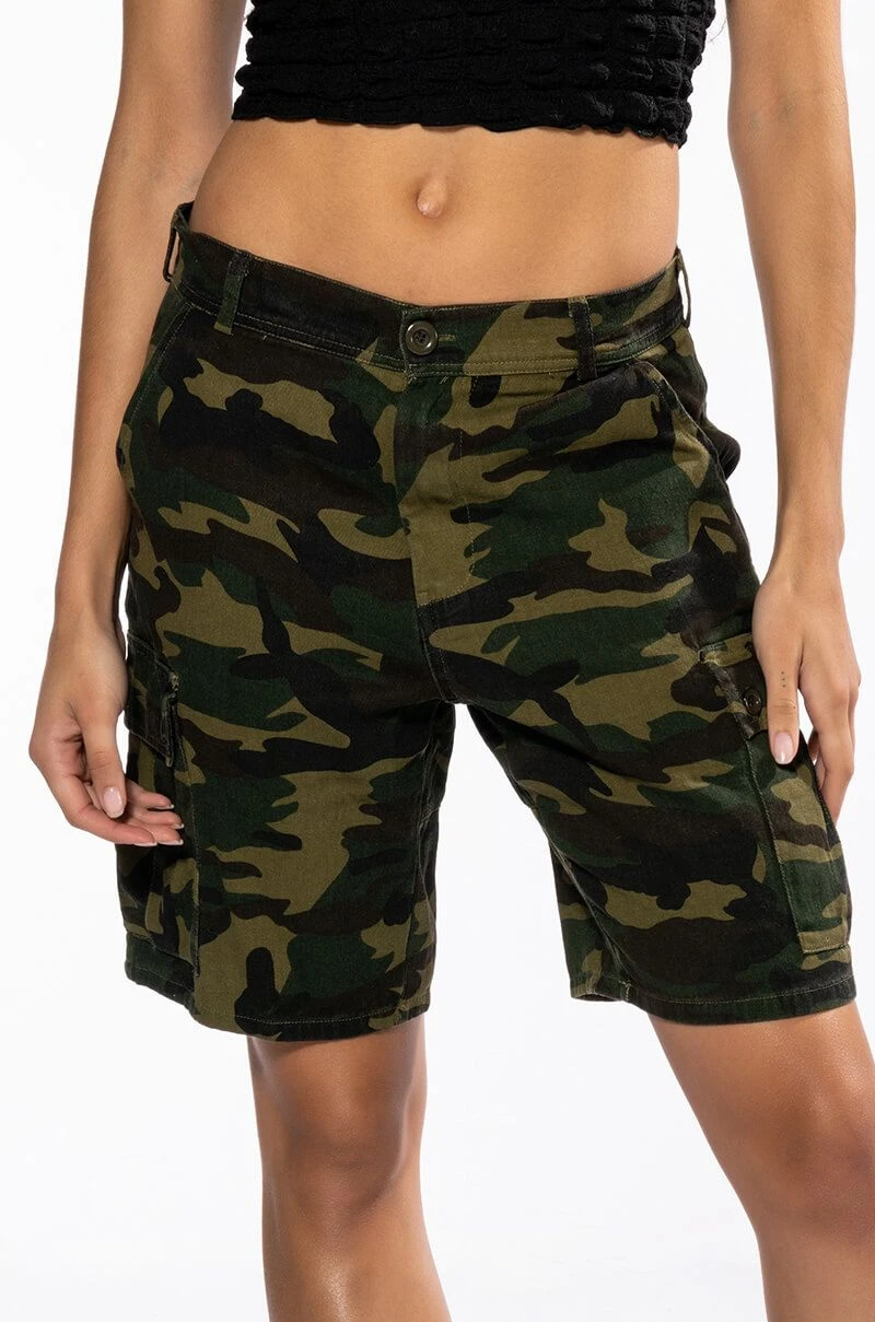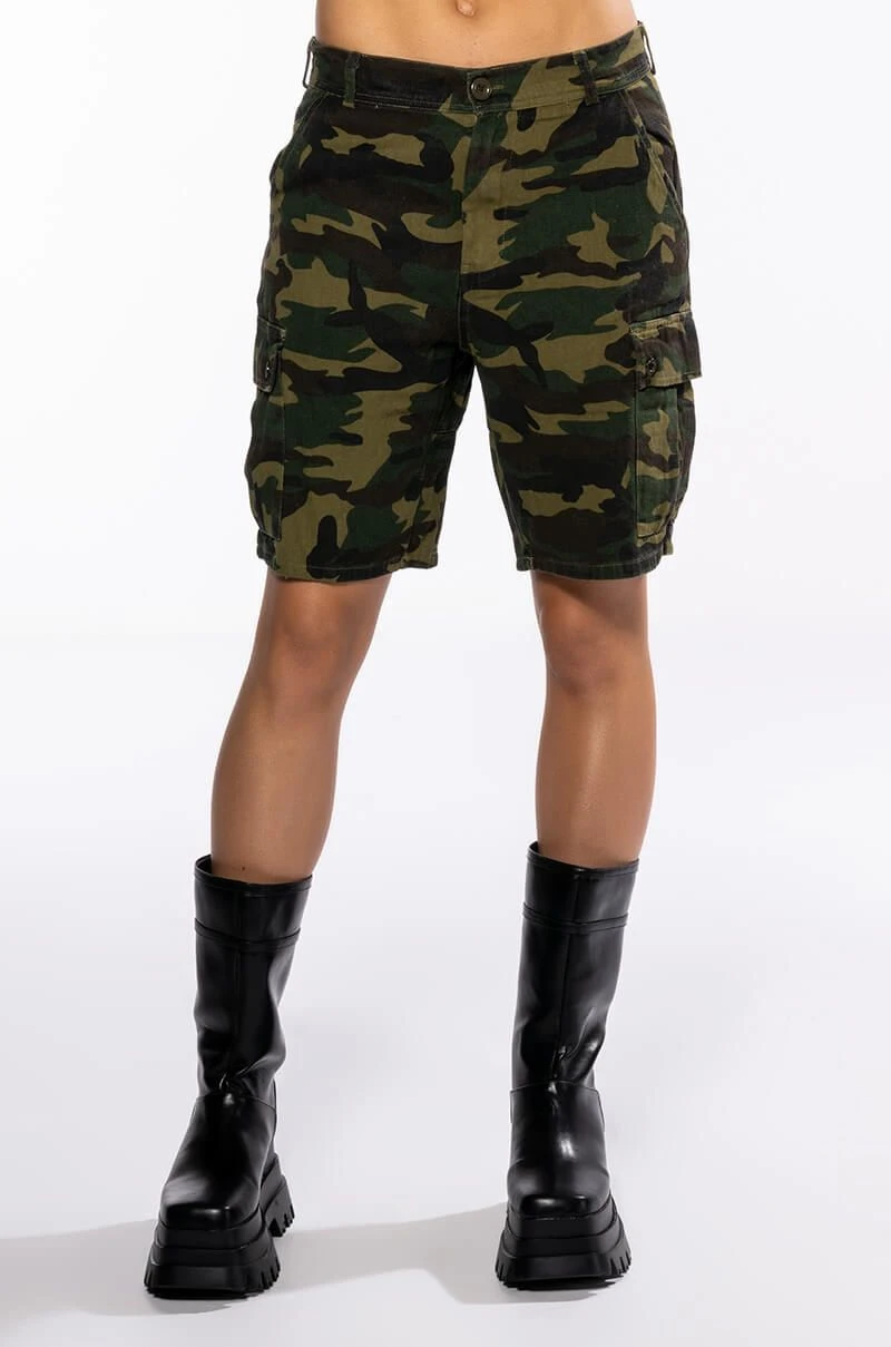 The AKIRA Label Tory Camo Shorts are made from a structured cotton and feature a camo print, a high rise waist, working belt loops, slant pockets, cargo button flap side and back pockets, a boxy fit, and a long inseam. Complete with a front button and zipper closure.