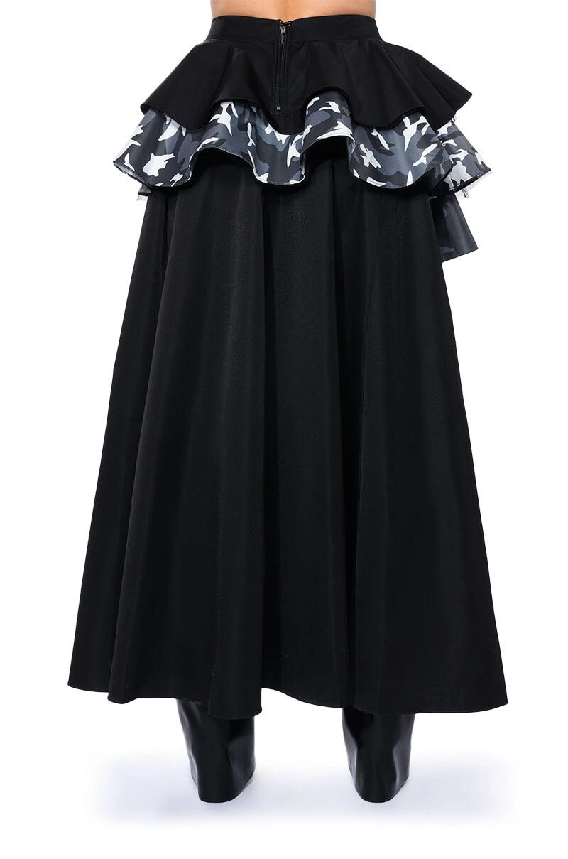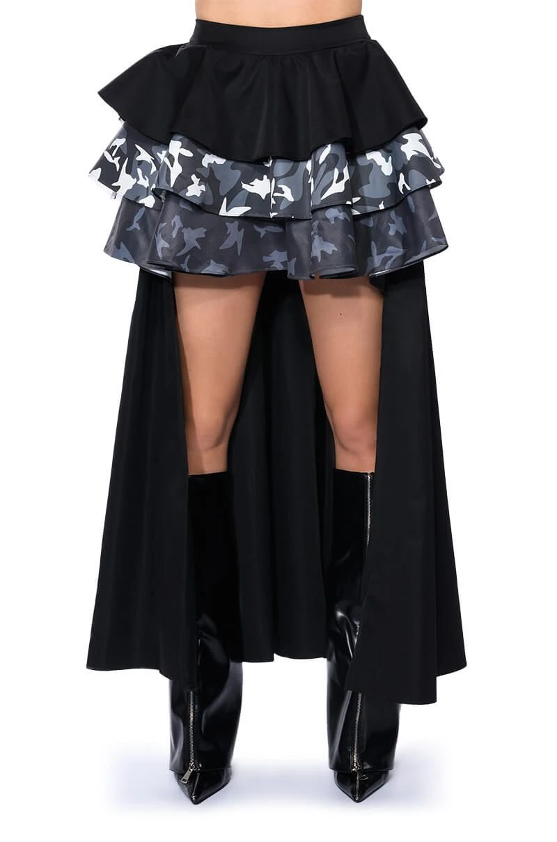 The AKIRA Label Unbothered High Low Hem Ruffle Maxi Skirt is made from a slick fabrication and features a high rise waist, a wide waistband, layered camo print ruffles with netting, a high low hem, a maxi length silhouette, and an exposed back zipper closure. Style this piece with a mock neck bodysuit and knee high boots to complete your fierce look.
