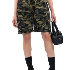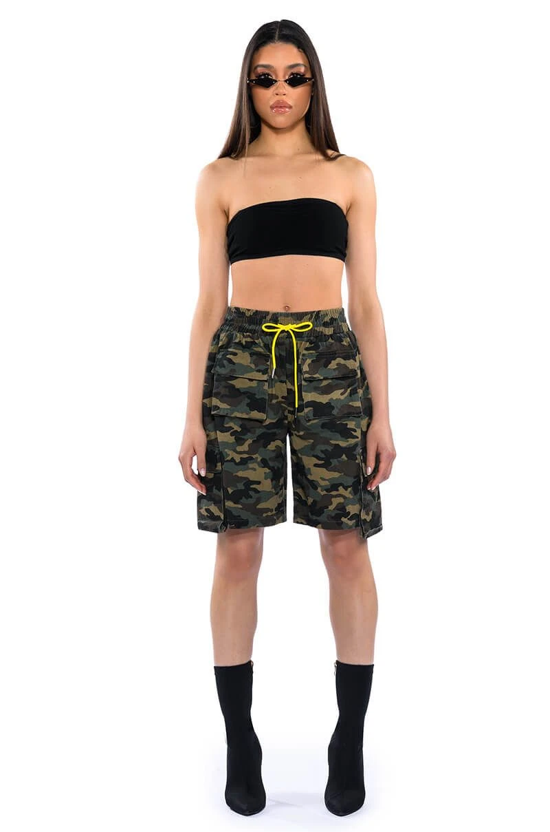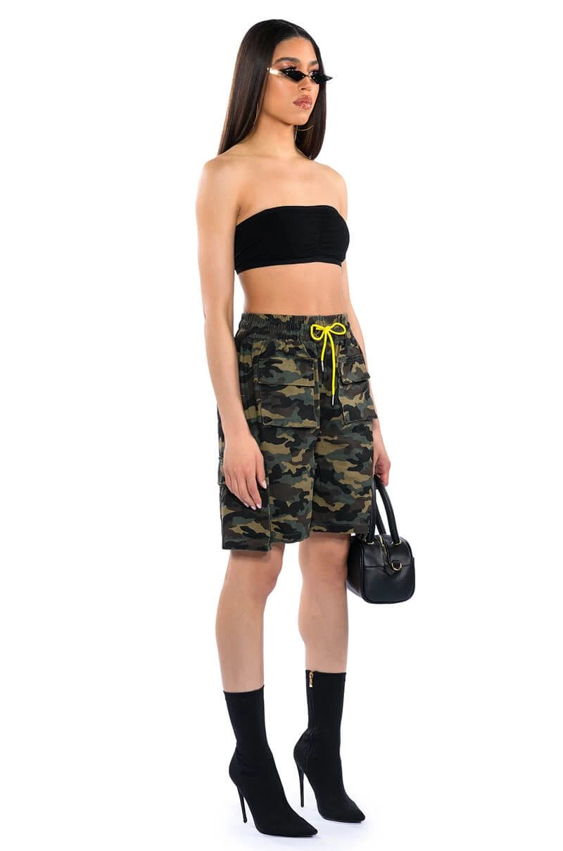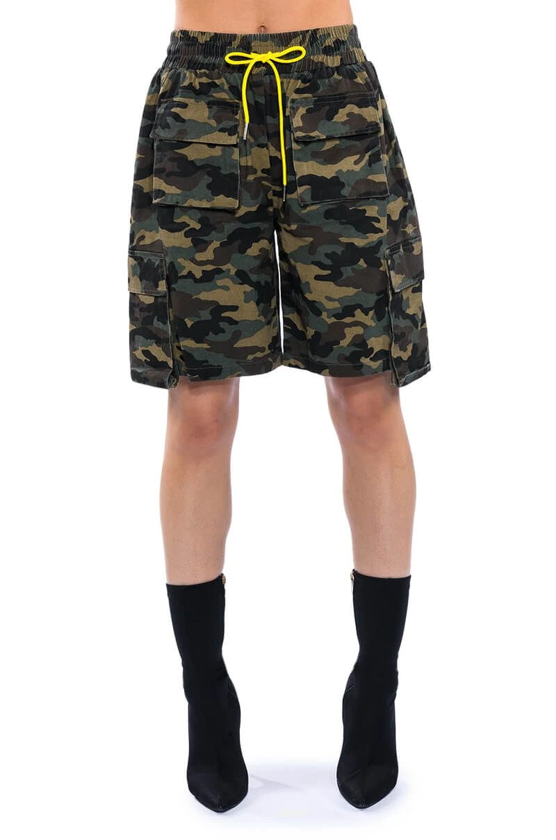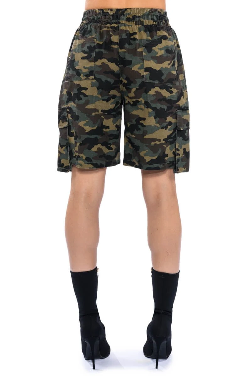 The AKIRA Label Unbothered Oversized Camo Shorts are made from a structured cotton and feature a graphic camo print, a high rise waist, a shirred elastic drawstring waistband, cargo flap front and side pockets, back pockets, a long inseam, and an oversized fit. Pair this piece with a bodysuit and combat boots to complete your look.