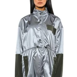 The AKIRA Label Unbothered Sporty Long Sleeve Romper features a satin-y windbreaker-inspired fabrication, a mock neck silhouette, attached shorts, long sleeves, a faux flap front chest pocket, and an adjustable ruched elastic waistband with toggle closures. Complete with zippered side pockets, a zip front closure, a pop button down front placket, and adjustable toggle hem detailing.