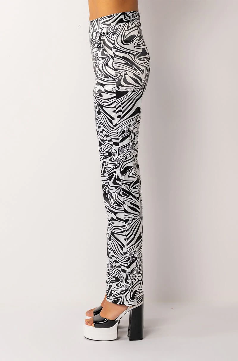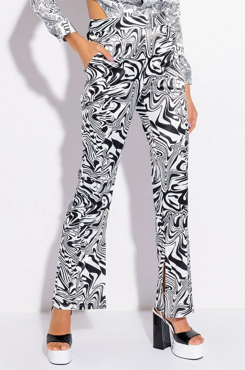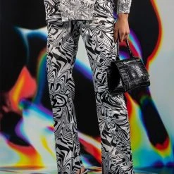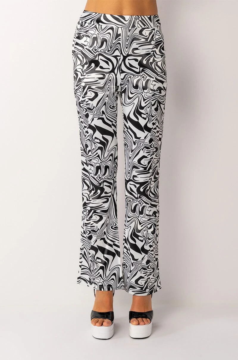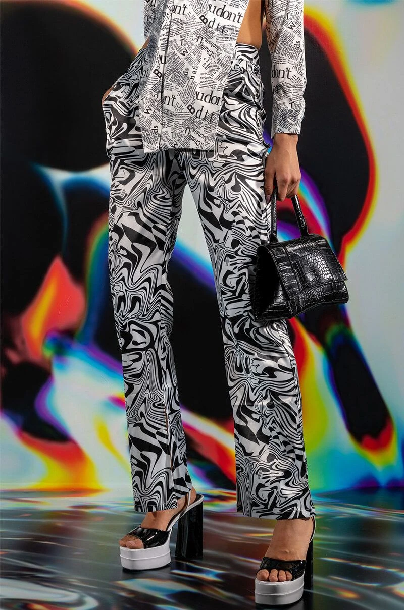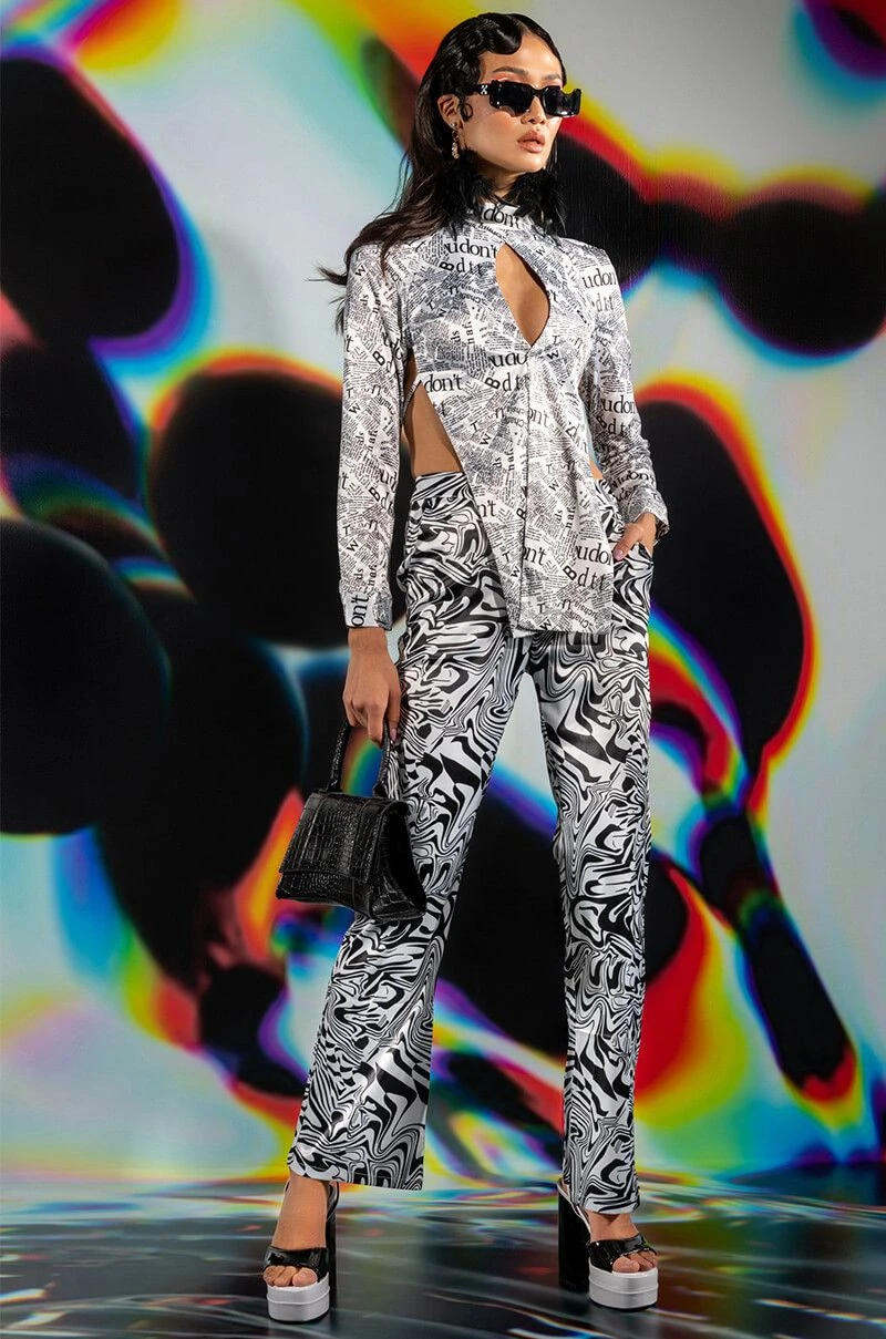 The AKIRA Label Utopia Flared Trouser is made from a lightweight satin fabrication and features a funky swirled print, a high rise waist, a thin waistband, slant side pockets, flared pant legs, and a tonal back zipper closure.