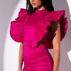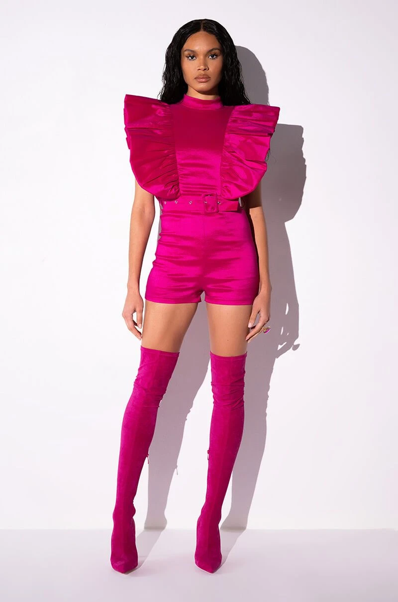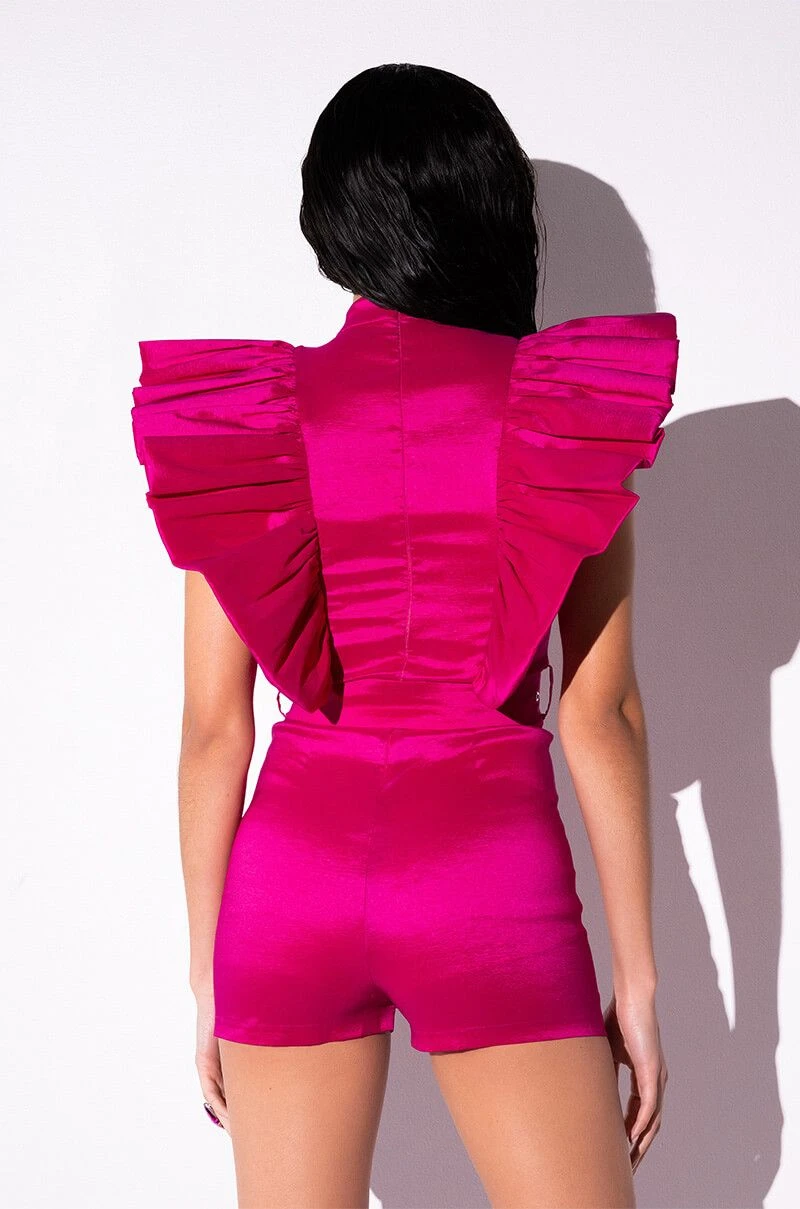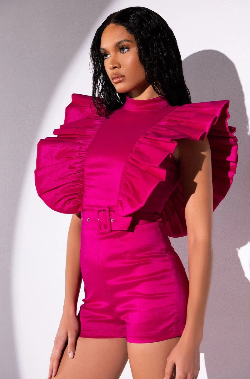 The AKIRA Label Valentina Taffeta Ruffle Sleeve Romper features a shimmering, textured taffeta fabrication, a mock neckline, a cap sleeve design, and ruffle trim detailing through the bodice and back. Complete with an adjustable waist belt, attached mini shorts, and a concealed back zipper closure.