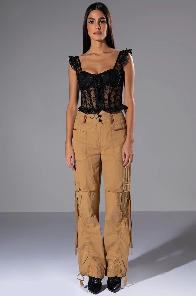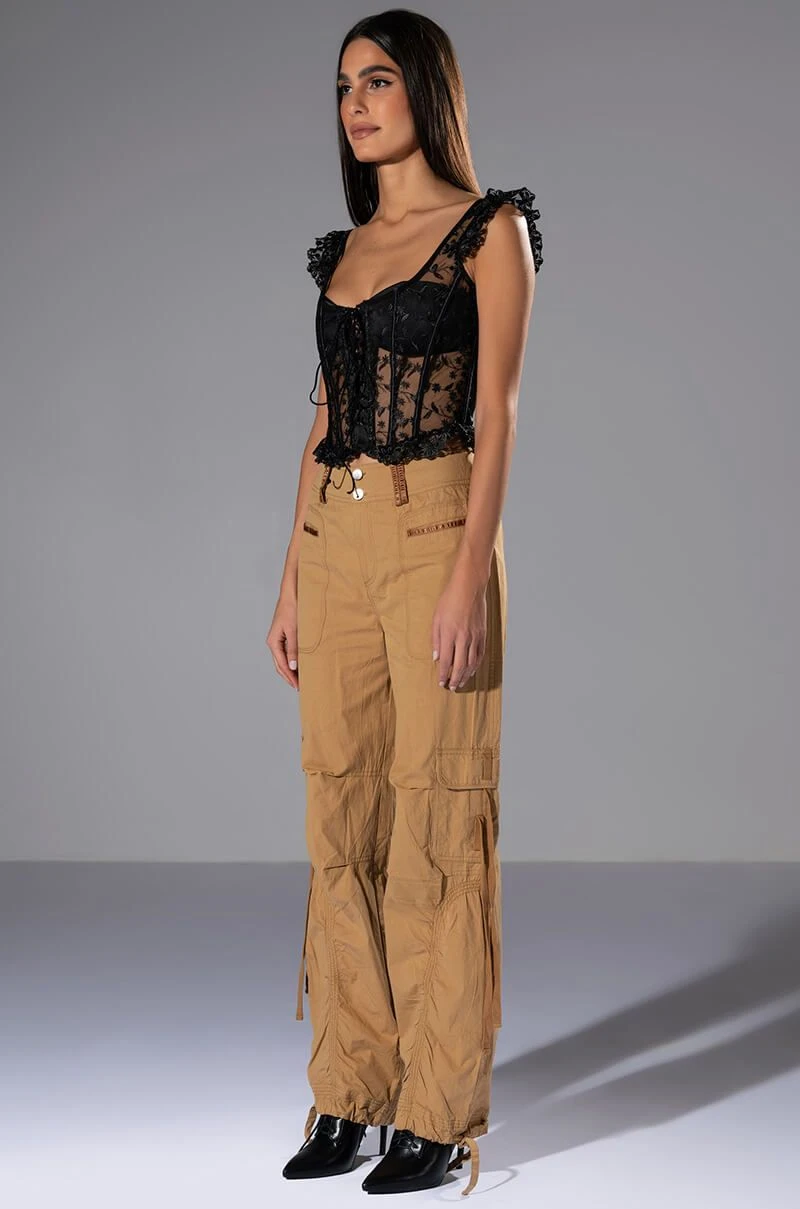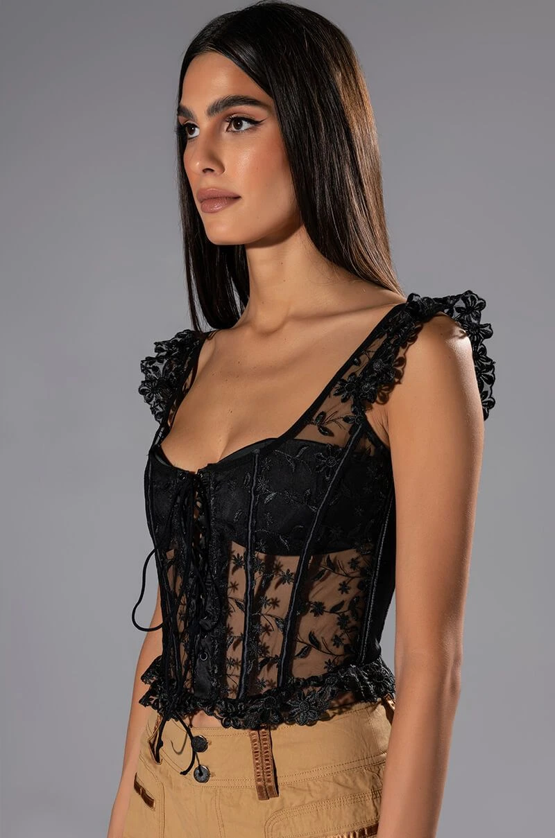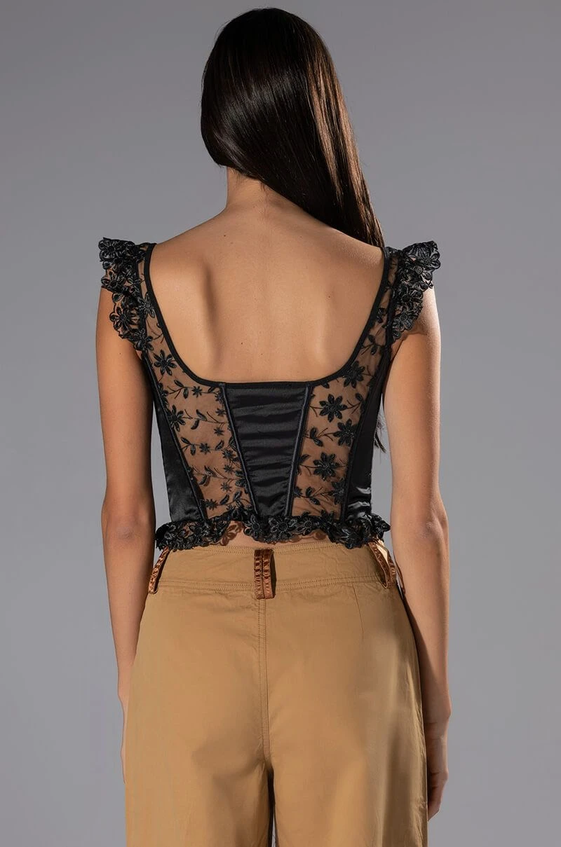 Come and get it, The AKIRA Label Ven Aqui Lace Up Corset Top has arrived! This sexy cropped number is made from a mesh base fabrication and features a beautiful all over embroidered floral design. Complete with ruffled embroidered tank straps, a scoop neckline, a lace up front enclosure, lightly padded cups, boning for structure, and a delicate lightly ruffled hem. Pair with your fave denim and stiletto pumps for a hot date night look.