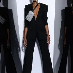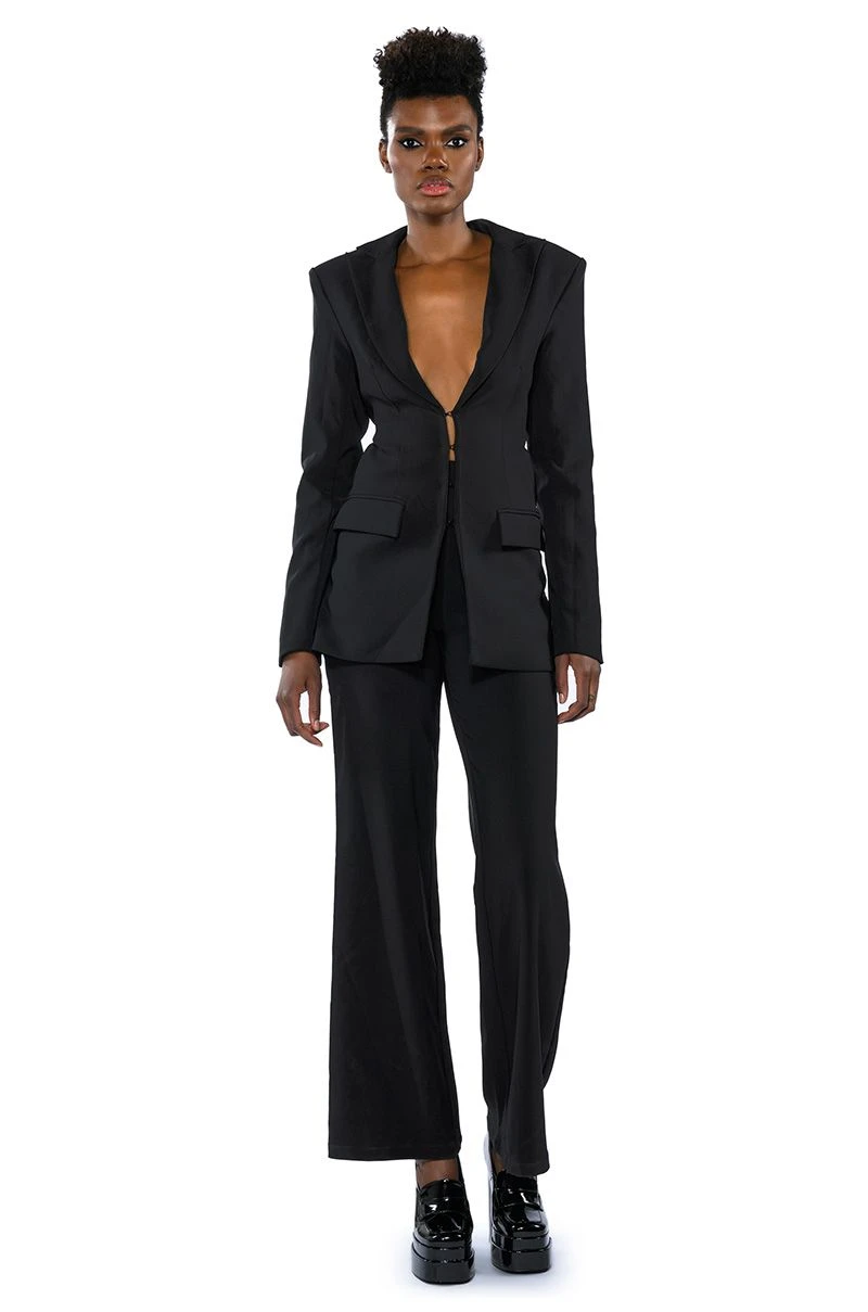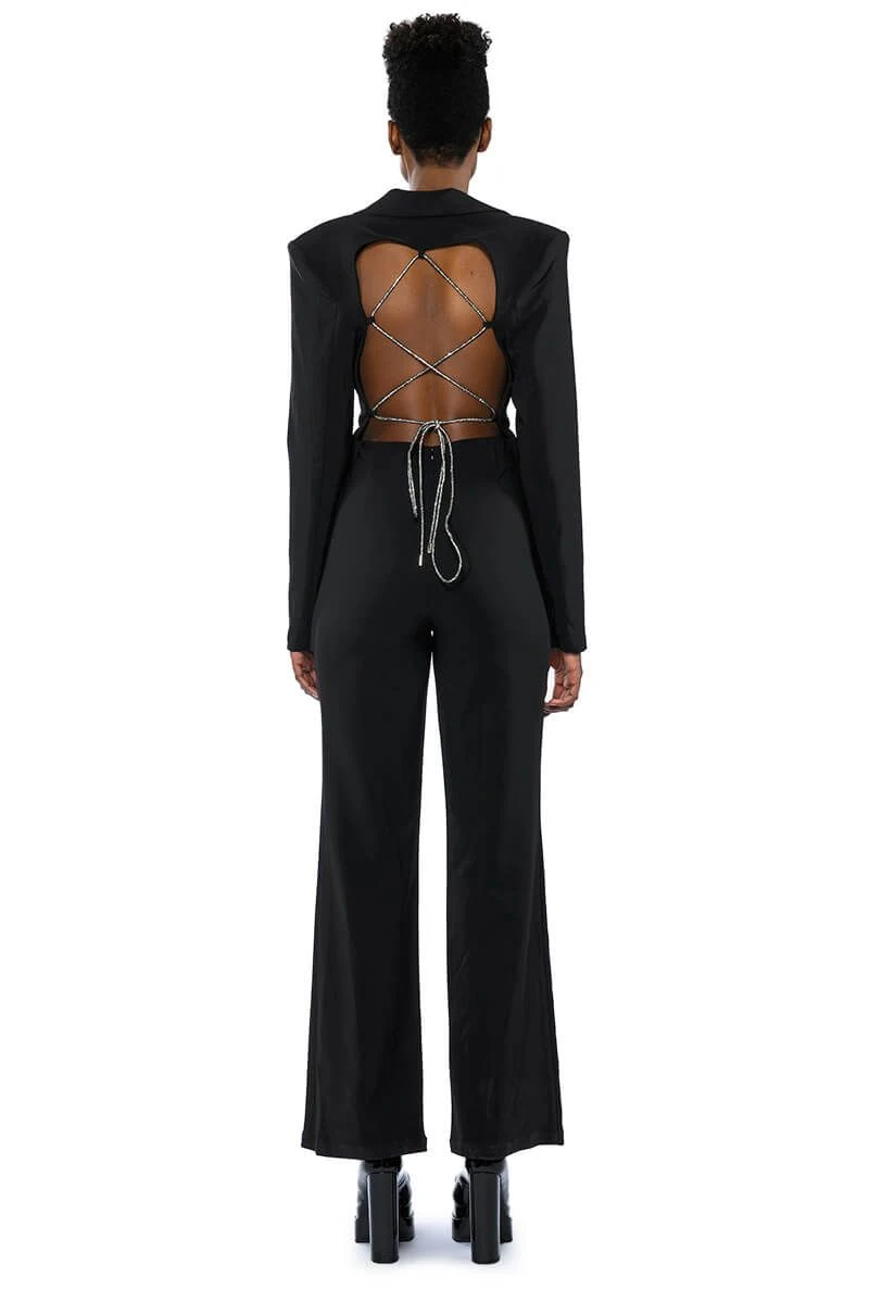 Bring new meaning to “business in the front, party in the back,” with The AKIRA Label Vibes So Rare Jumpsuit. This sexy piece features a sleek, smooth poly-blend fabrication, a plunging lapel collar neckline, long sleeves, padded shoulders, functional flap front pockets, and hook and eye front closures. Complete with a backless design, rhinestone lace up cord detailing, attached straight leg pants, and a tonal back zipper closure.
