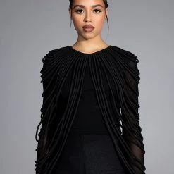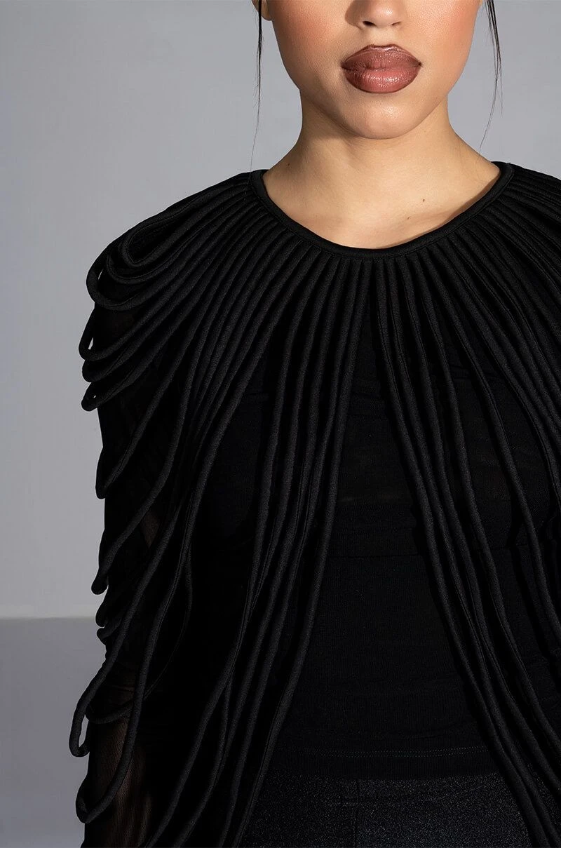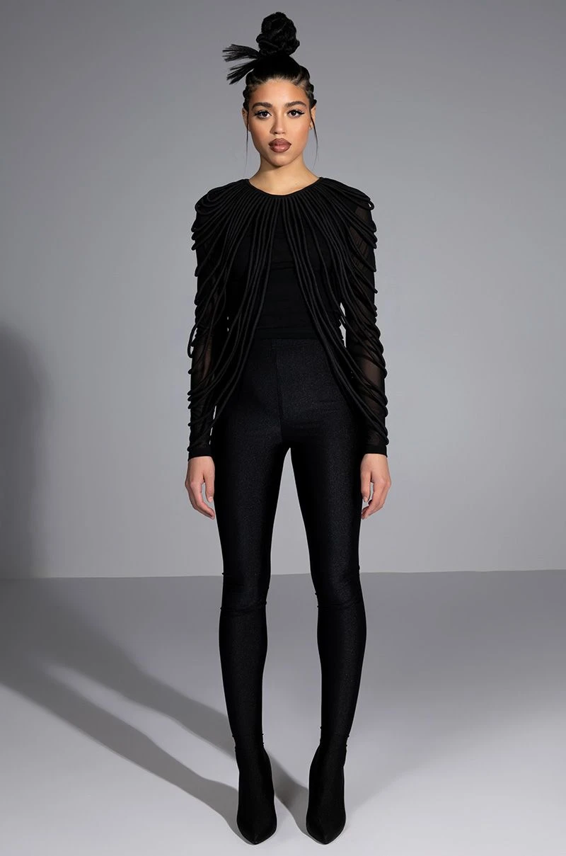The AKIRA Label Wavy Baby Long Sleeve String Detail Mesh Top features a sheer mesh base, long sleeves, a scoop neckline, and voluminous strappy detail overlay throughout. Complete your look with a sleek bodysuit, pleather pants, and stiletto heeled sandals.