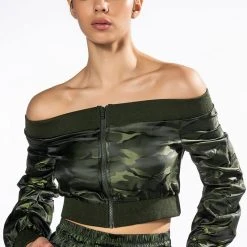 The AKIRA Label Youre The Problem Zip Up Top features a sleek nylon fabrication, long sleeves, an off the shoulder silhouette, a cropped cut, and wide ribbed knit hems. Complete with a tonal zip front closure and camo print patterning. Pair with the coordinating AKIRA Label Youre The Problem Jogger for a complete look.